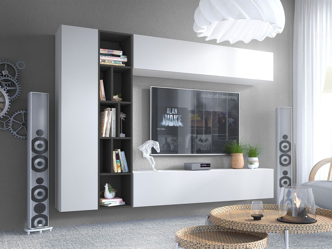 • Wohnwand Anbauwand XARI II PGAS-K mit Push - Click und Bio-Ethanol Kamin