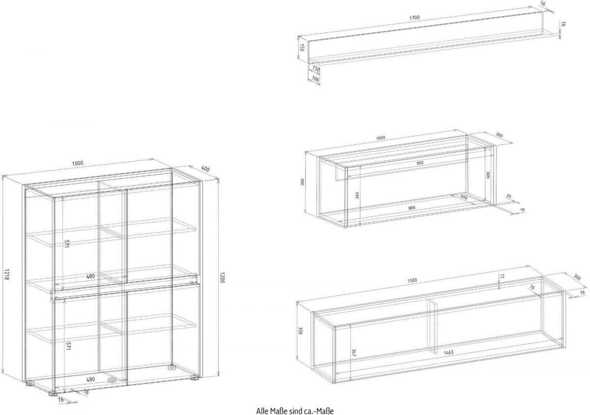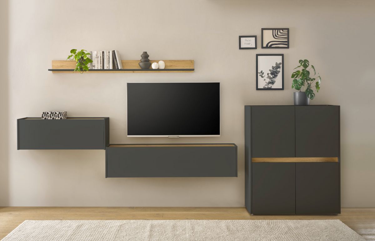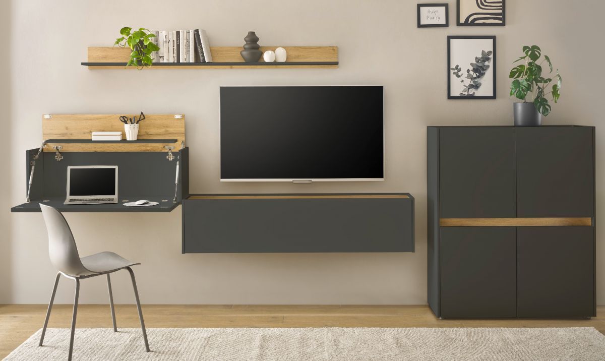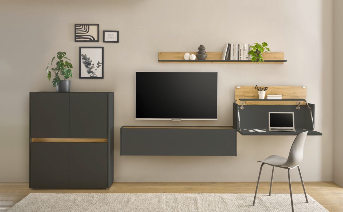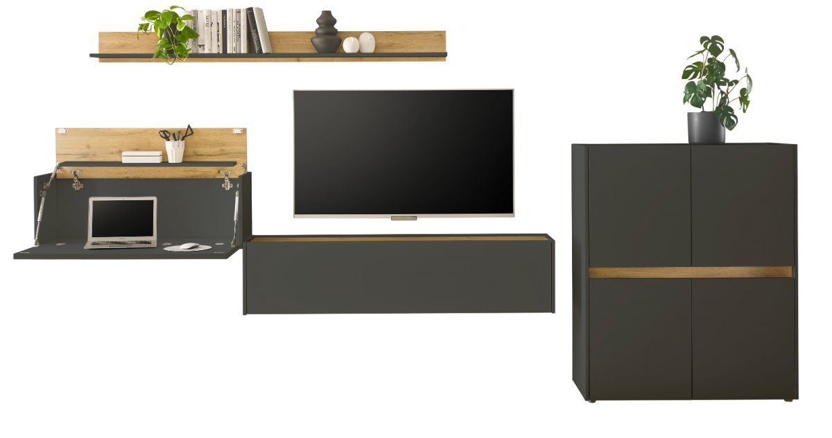 Wohnwand mit Sekretär grau Wotan Eiche Wohnzimmer Schrankwand Home Office Center