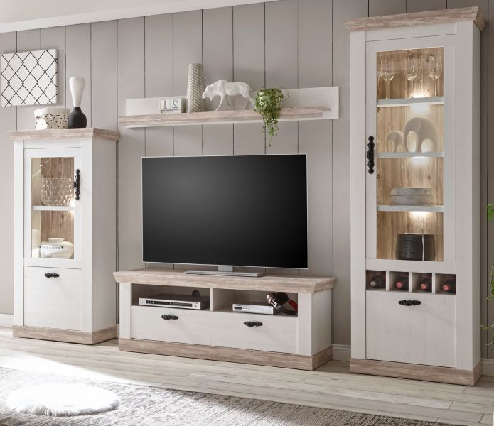 Wohnwand Pinie weiß Schrankwand Landhaus Wohnzimmer Anbauwand mit Vitrine Rovola