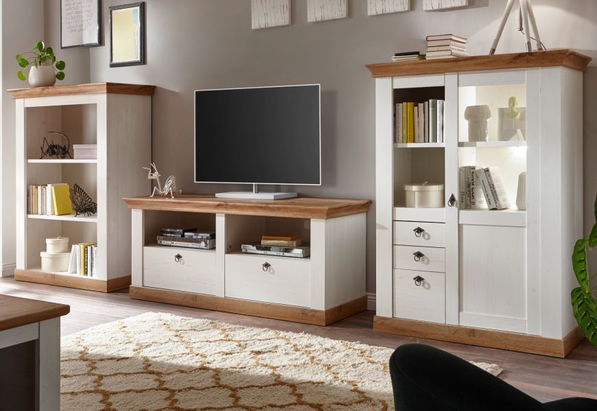 Wohnwand Schrankwand Eiche weiß Pinie Anbauwand Landhaus Set 376 cm 3-tlg Hemsby