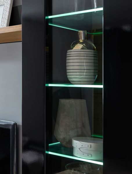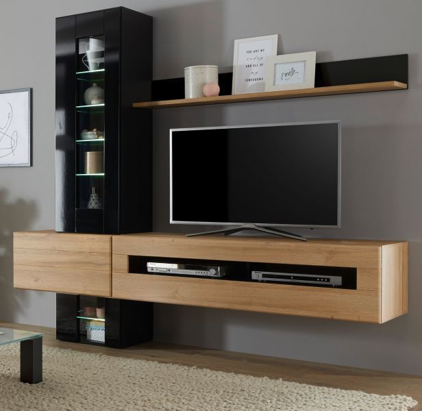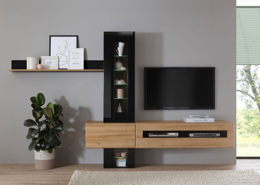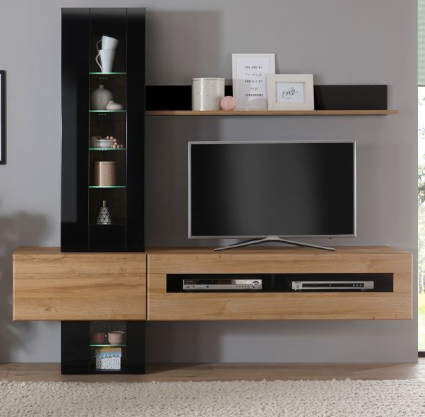 Wohnwand Schrankwand Hochglanz schwarz und Eiche Wohnzimmer Design Möbel Savanna