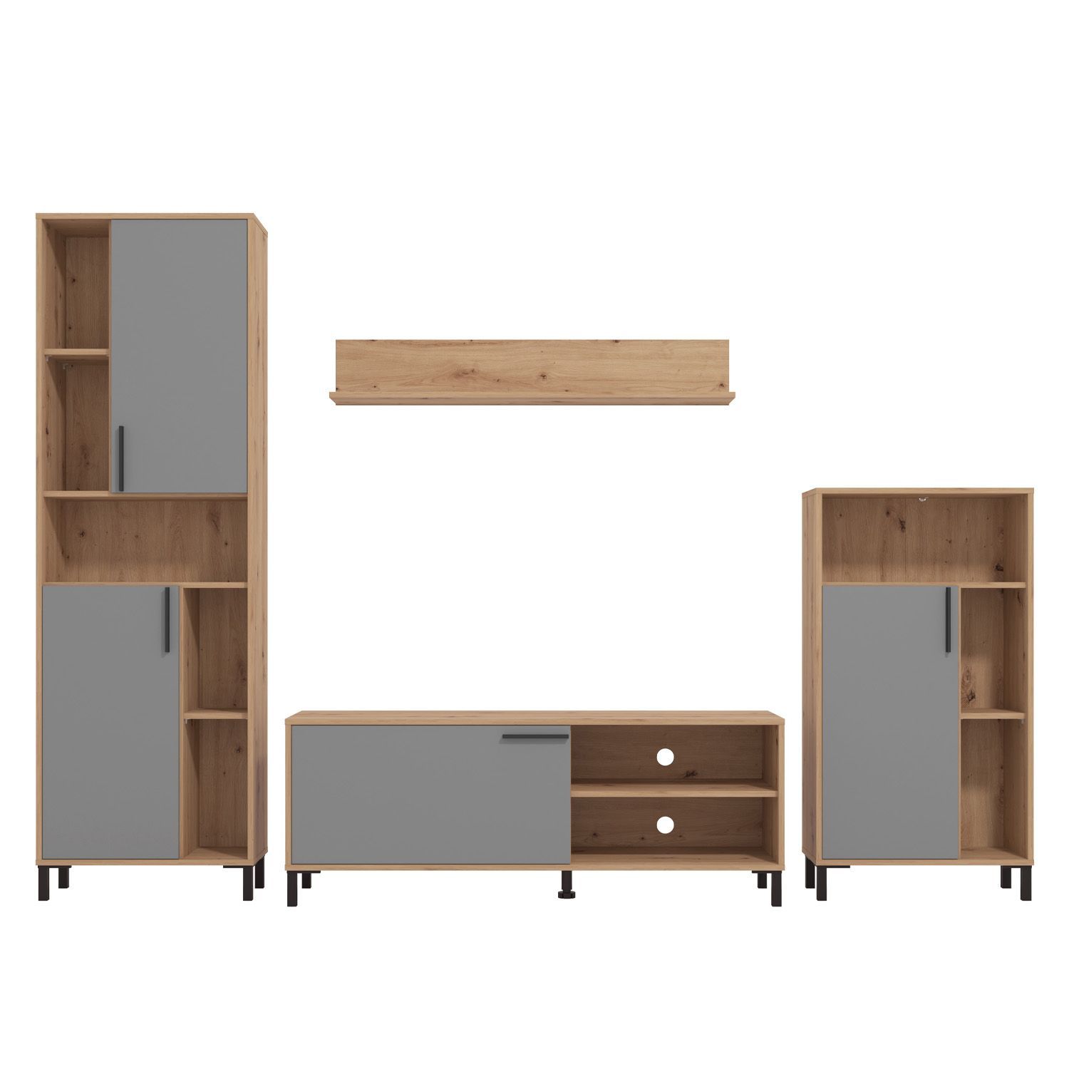Wohnwand Schrankwand Holz Eiche Grau Anbauwand Wohnzimmer-Set 4 tlg. Modern Entert...