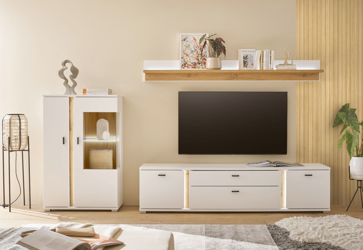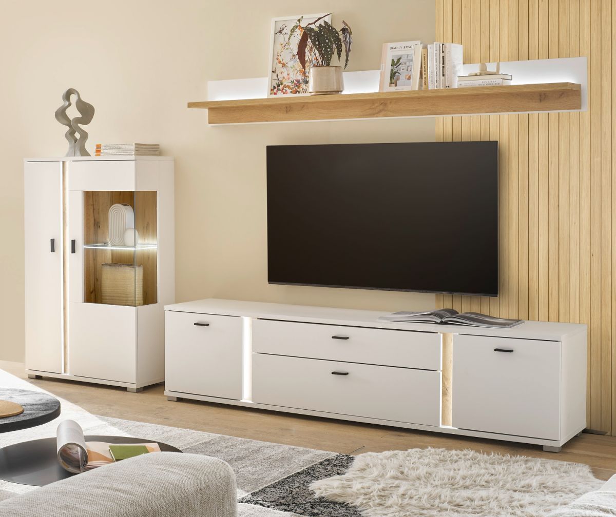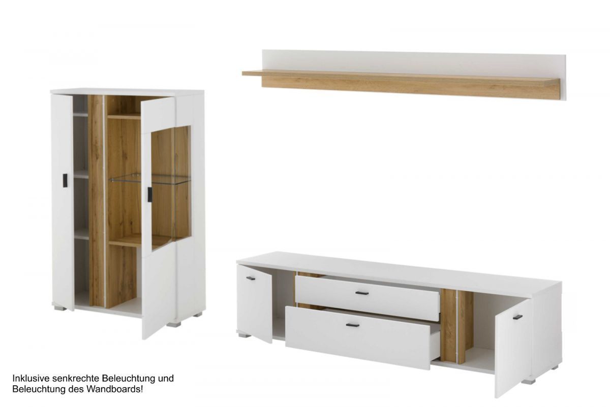 Wohnwand Schrankwand Set 3-tlg weiß matt Eiche inkl Beleuchtung Soft-Close Bellport