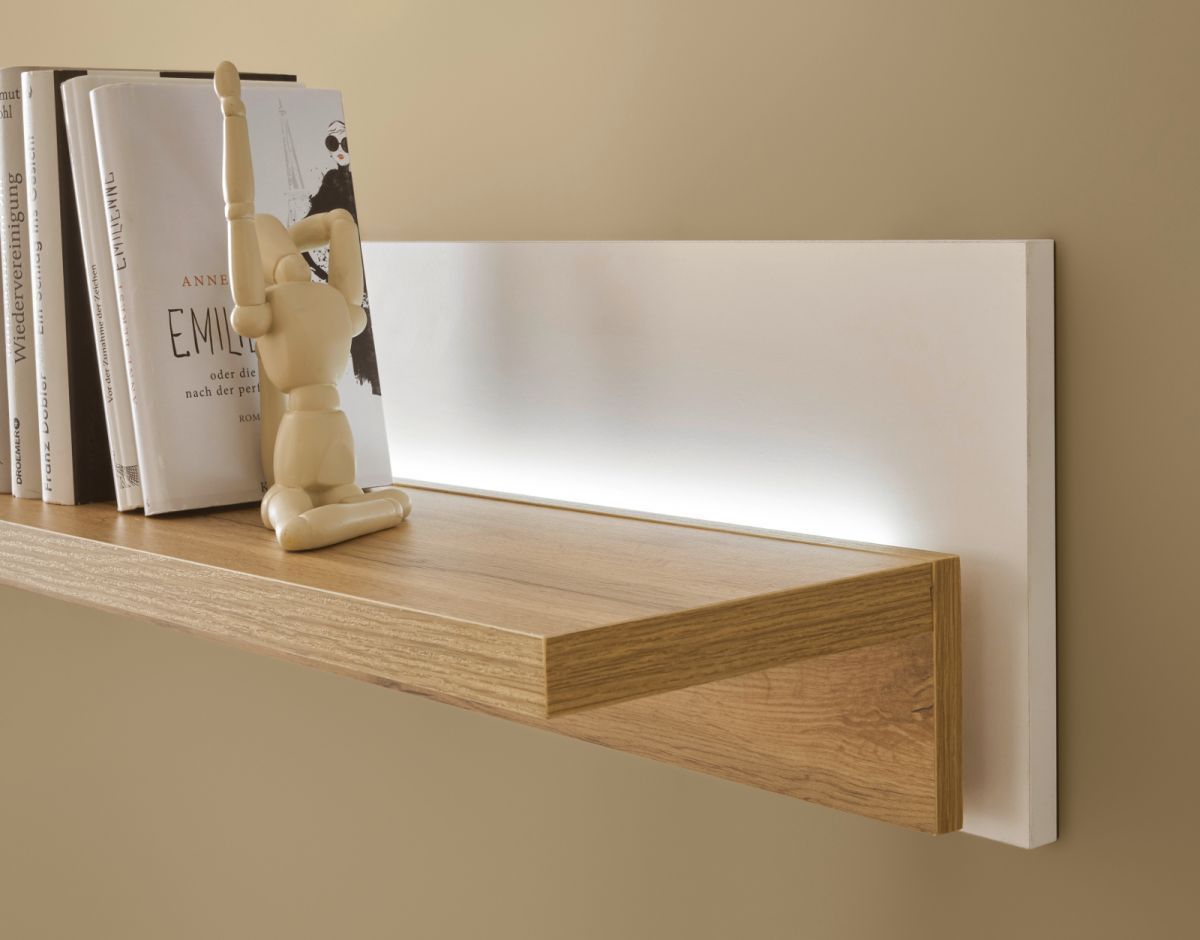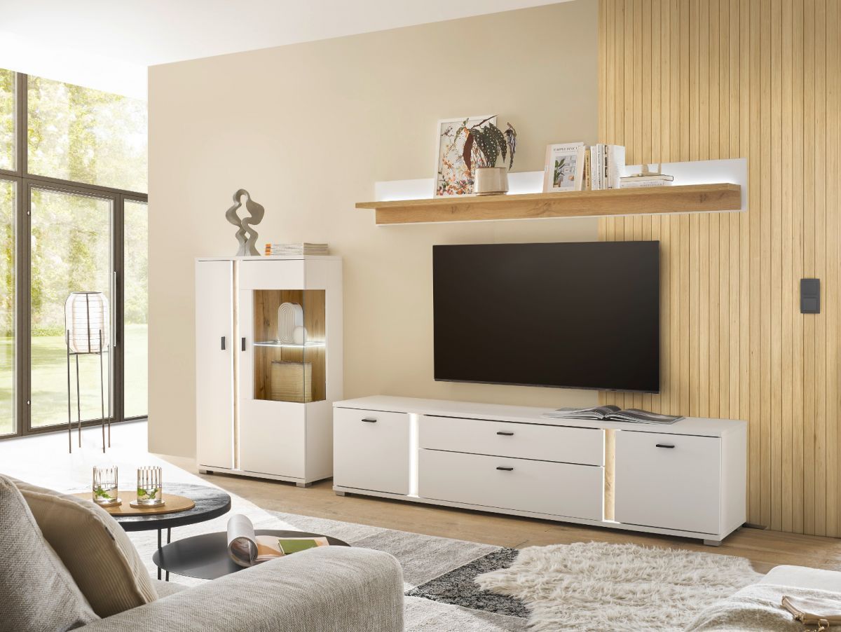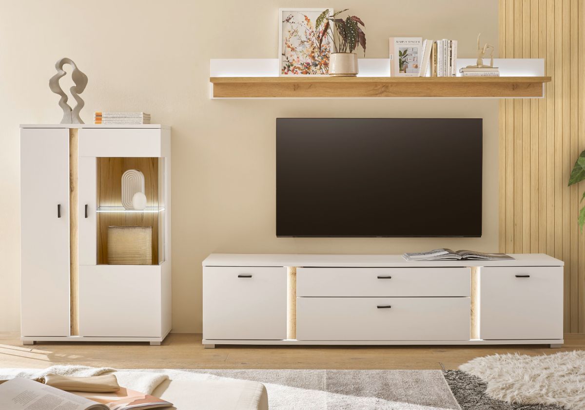 Wohnwand Schrankwand Set 3-tlg weiß matt Eiche inkl Beleuchtung Soft-Close Bellport