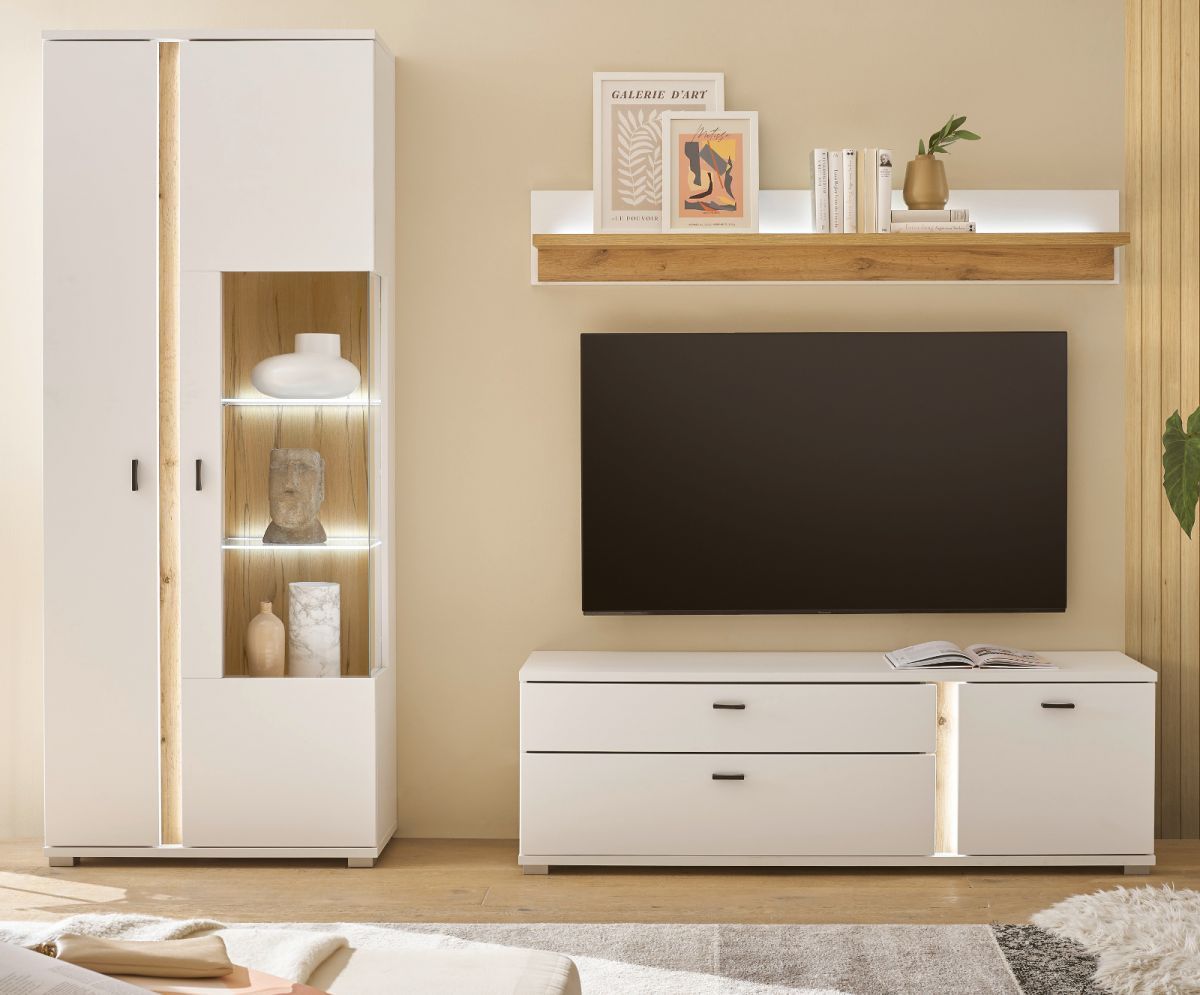 Wohnwand Schrankwand Set 3-tlg weiß matt Eiche inkl Beleuchtung Soft-Close Bellport