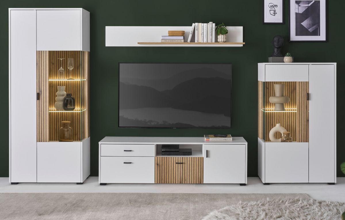 Wohnwand Schrankwand Set 4-tlg Anbauwand mit Soft-Close weiß matt Eiche Merced 320 cm