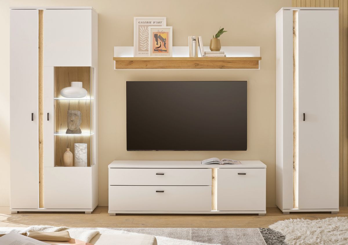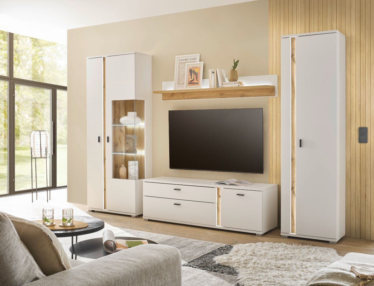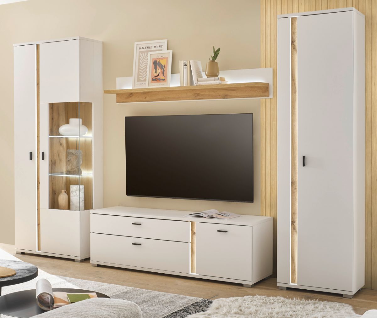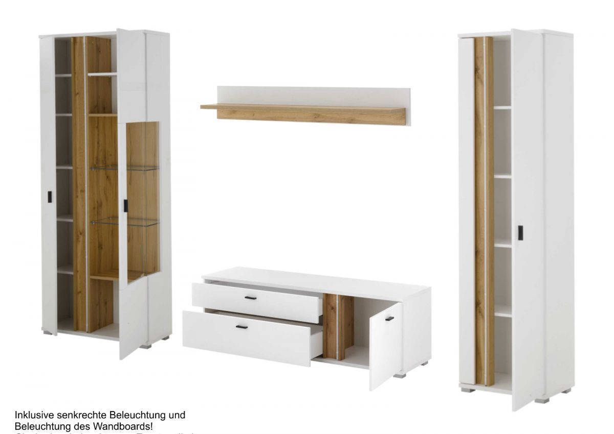 Wohnwand Schrankwand Set 4-tlg inkl Beleuchtung Soft-Close weiß matt Eiche Bellport