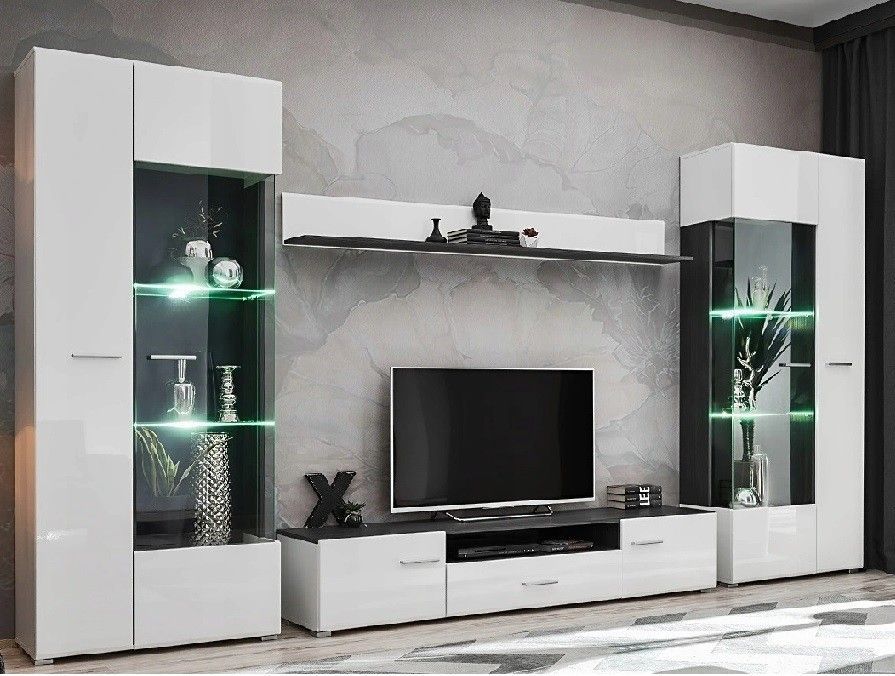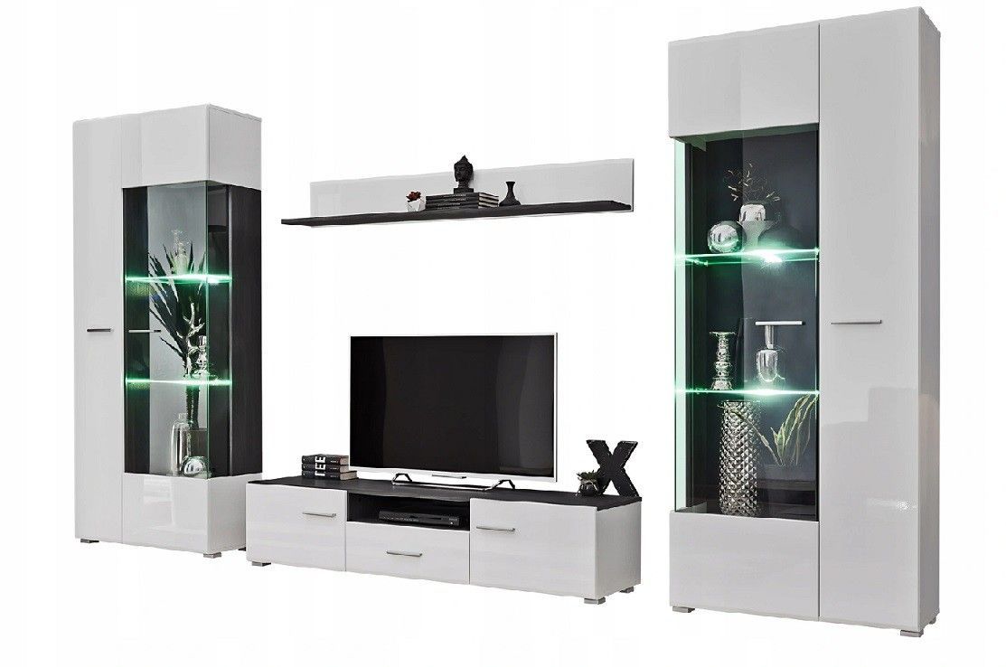 Wohnwand Schrankwand SOLIDO TWIN - Weiß Hochglanz , Holzoptik mit Led Beleuchtung