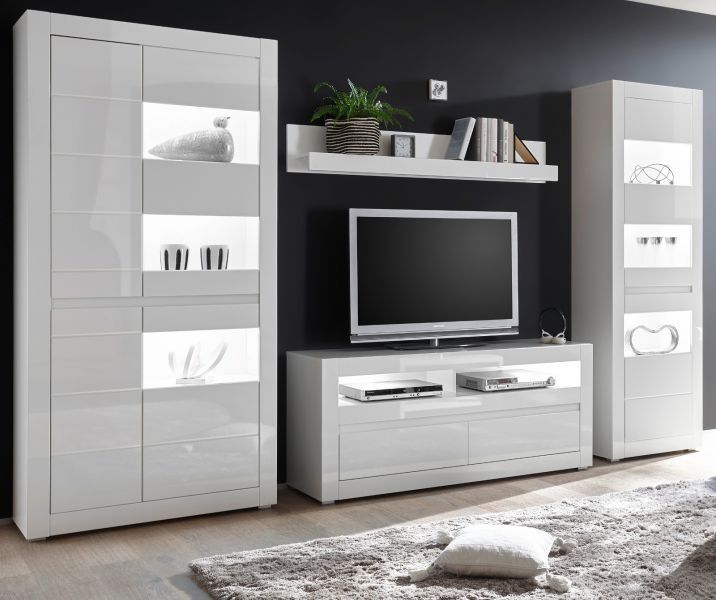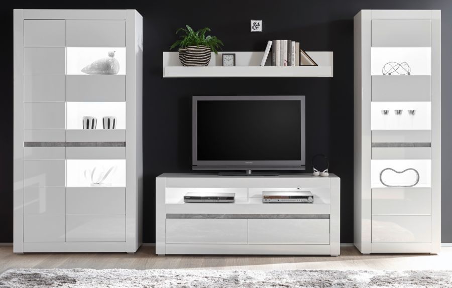 Wohnwand Schrankwand weiß Hochglanz / grau 2 x Vitrine und TV Komforthöhe Nobile