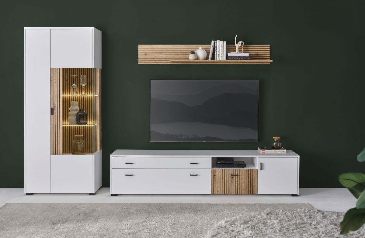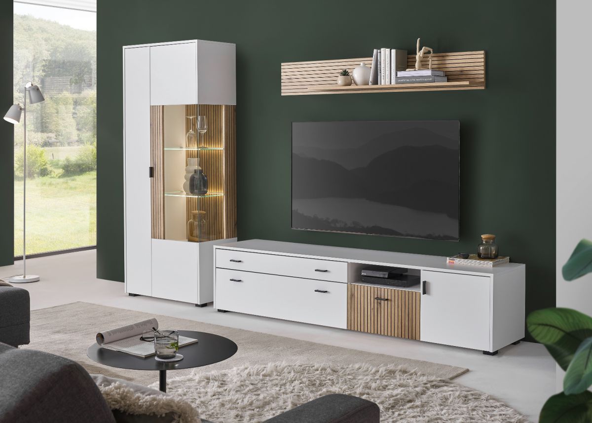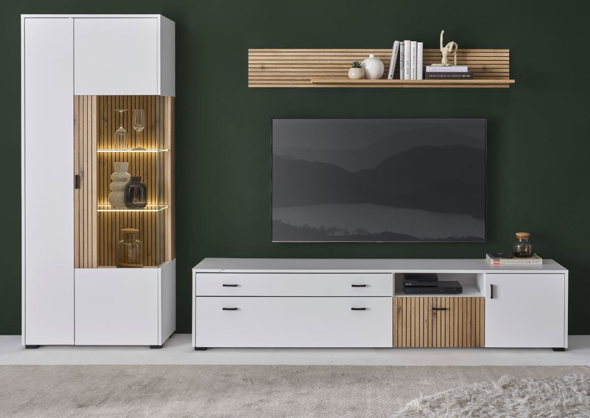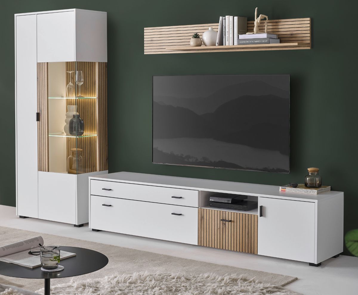 Wohnwand Schrankwand weiß matt Eiche Anbauwand mit Soft-Close Merced 285 cm