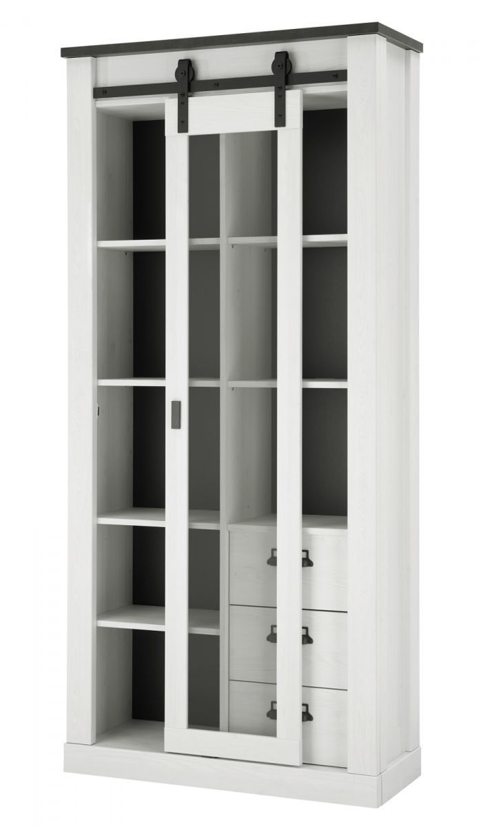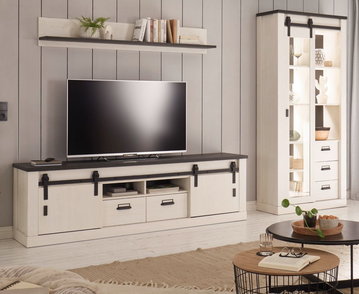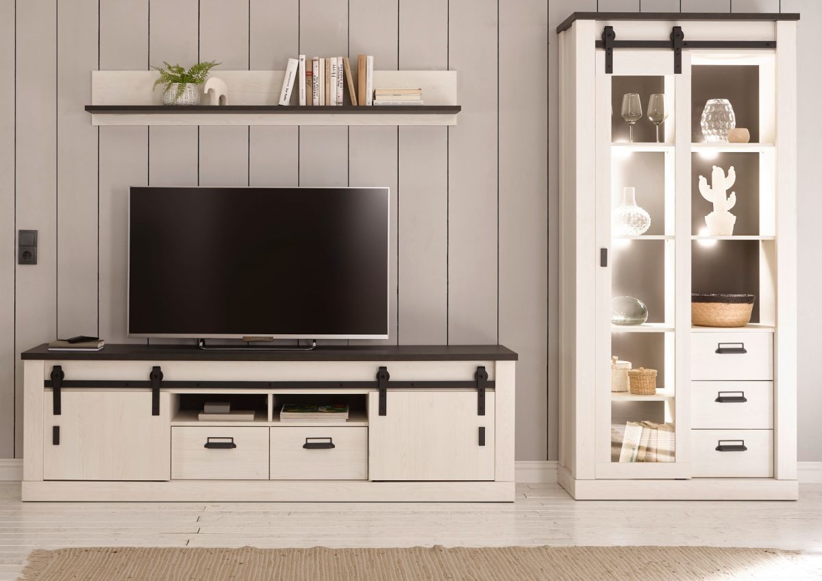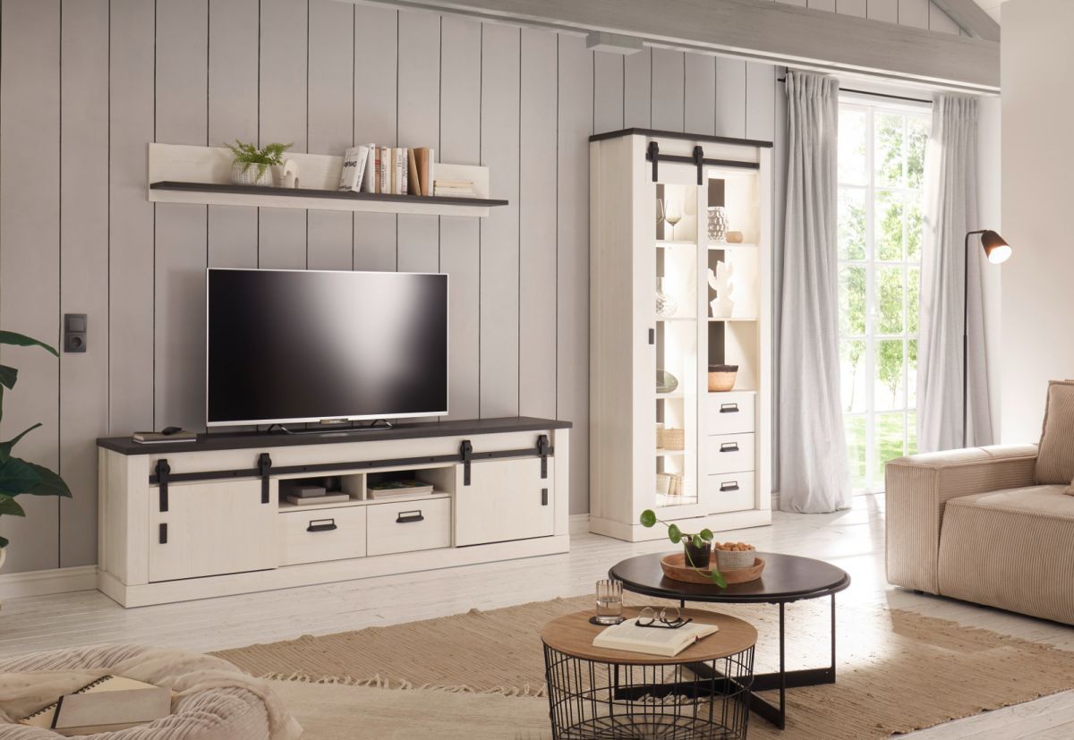 Wohnwand Schrankwand weiß Pinie Landhaus Anbauwand Vitrinenschrank 315 cm Stove