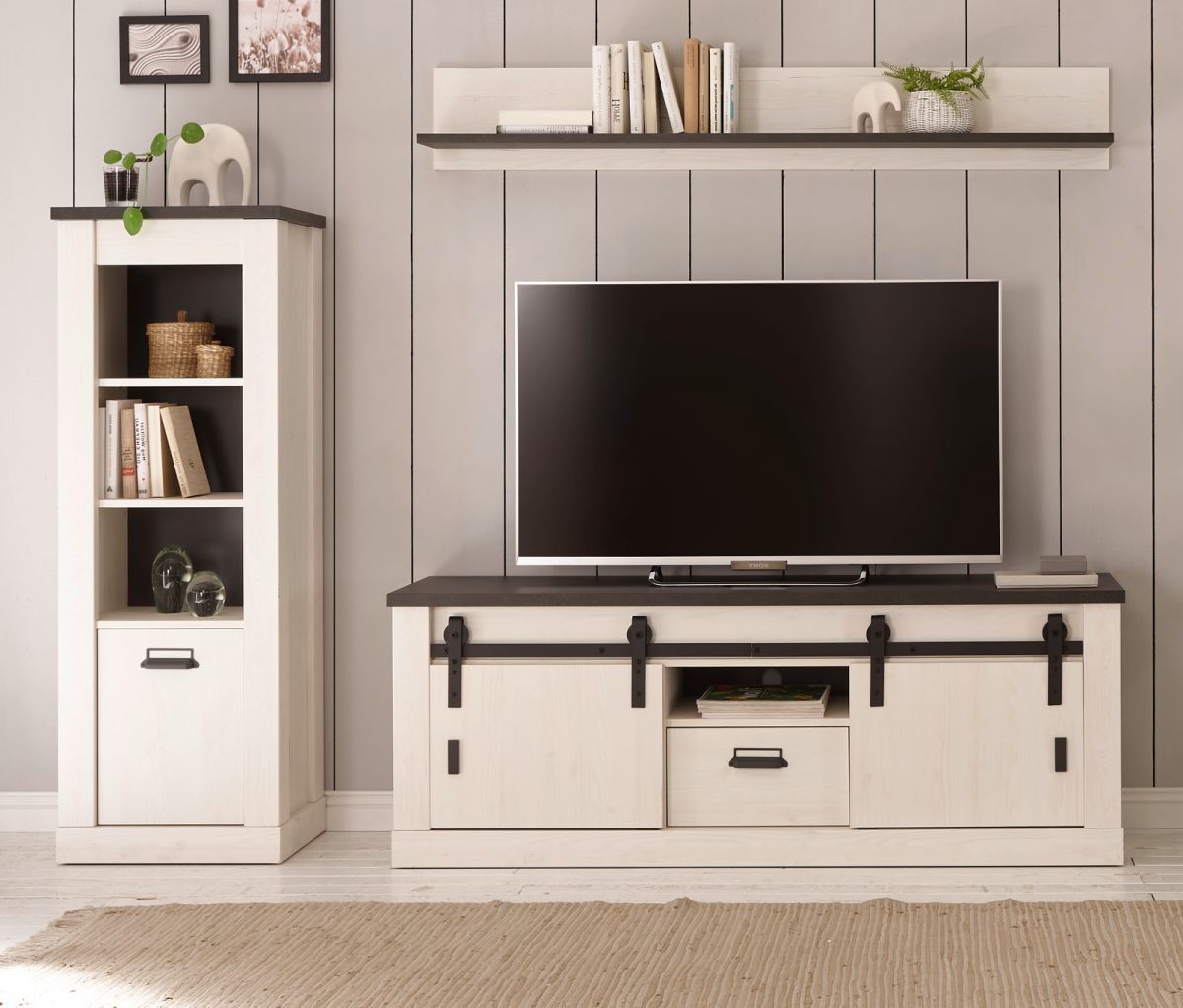 Wohnwand Schrankwand weiß Pinie Landhaus Anbauwand Wohnzimmer Set 230 cm Stove