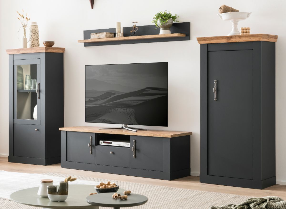 Wohnwand Schrankwand Wohnzimmer Anbauwand mit Soft-Close grau Eiche 322 cm Ribera