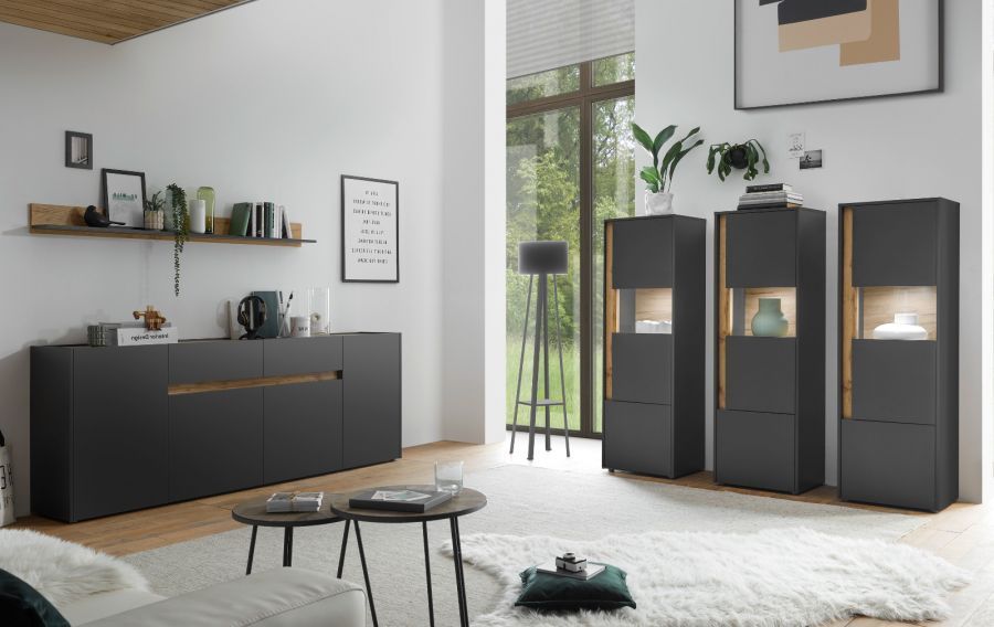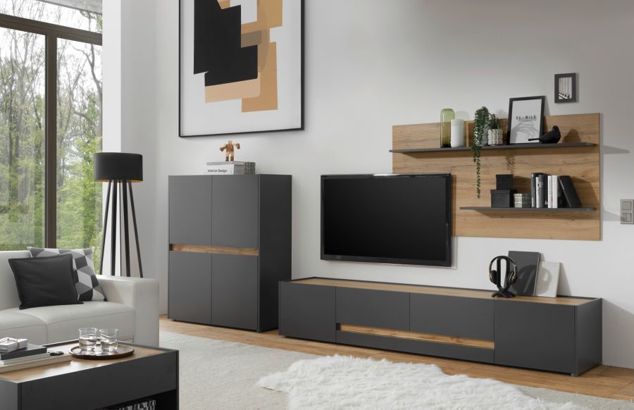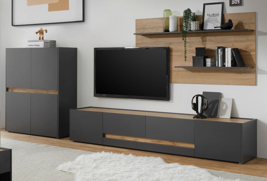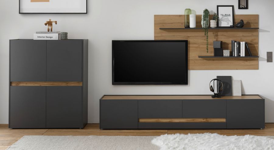Wohnwand Schrankwand Wohnzimmer Kombination grau Eiche mit Lowboard groß Center