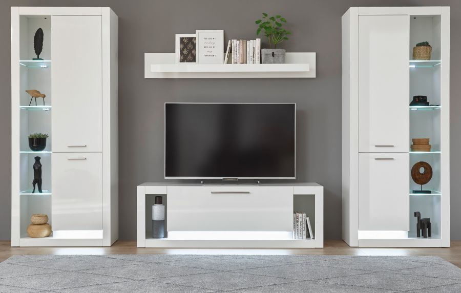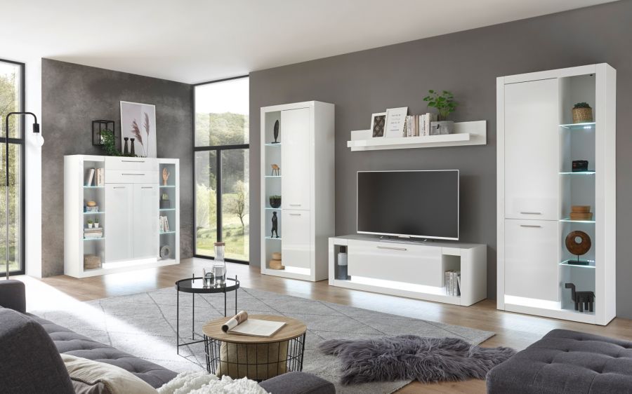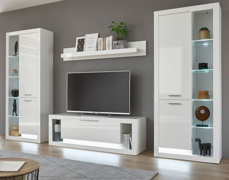 Wohnwand Schrankwand Wohnzimmer Möbel 350 cm 4-teilig in weiß Hochglanz Ladis