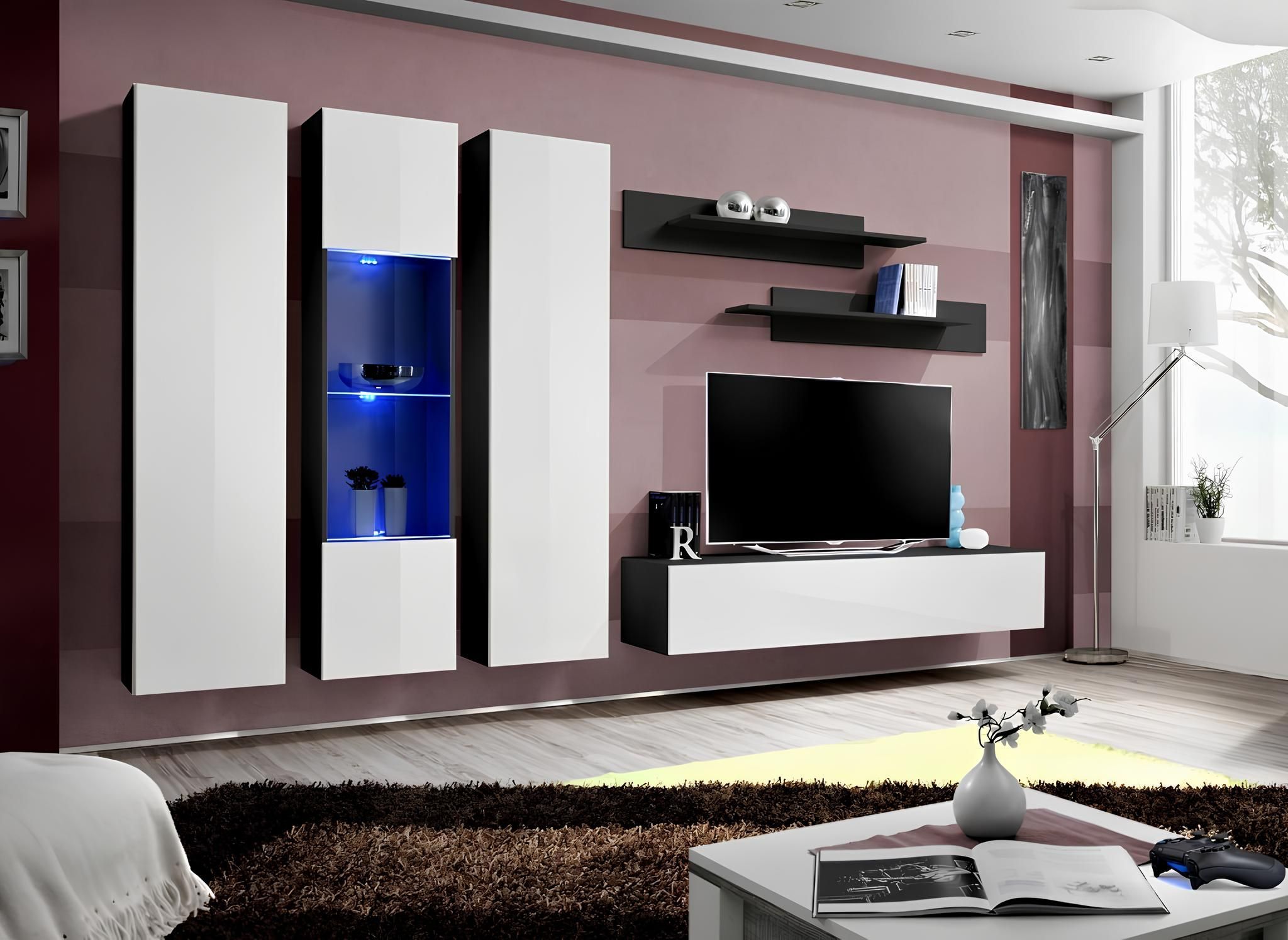 Wohnwand Set 6 tlg Wohnzimmer TV-Ständer Hänge Vitrine Regal Garnitur Holzmöbel