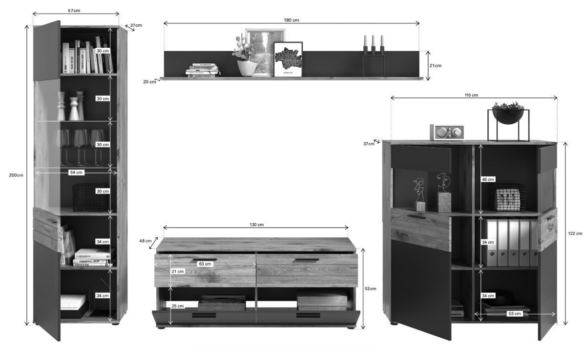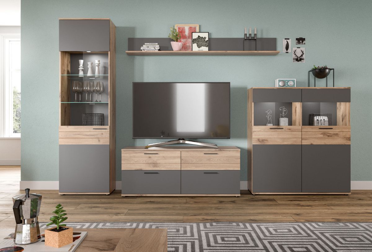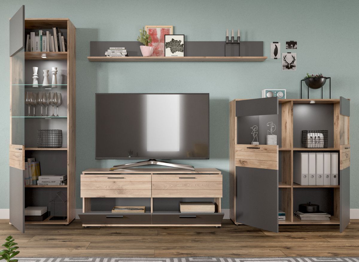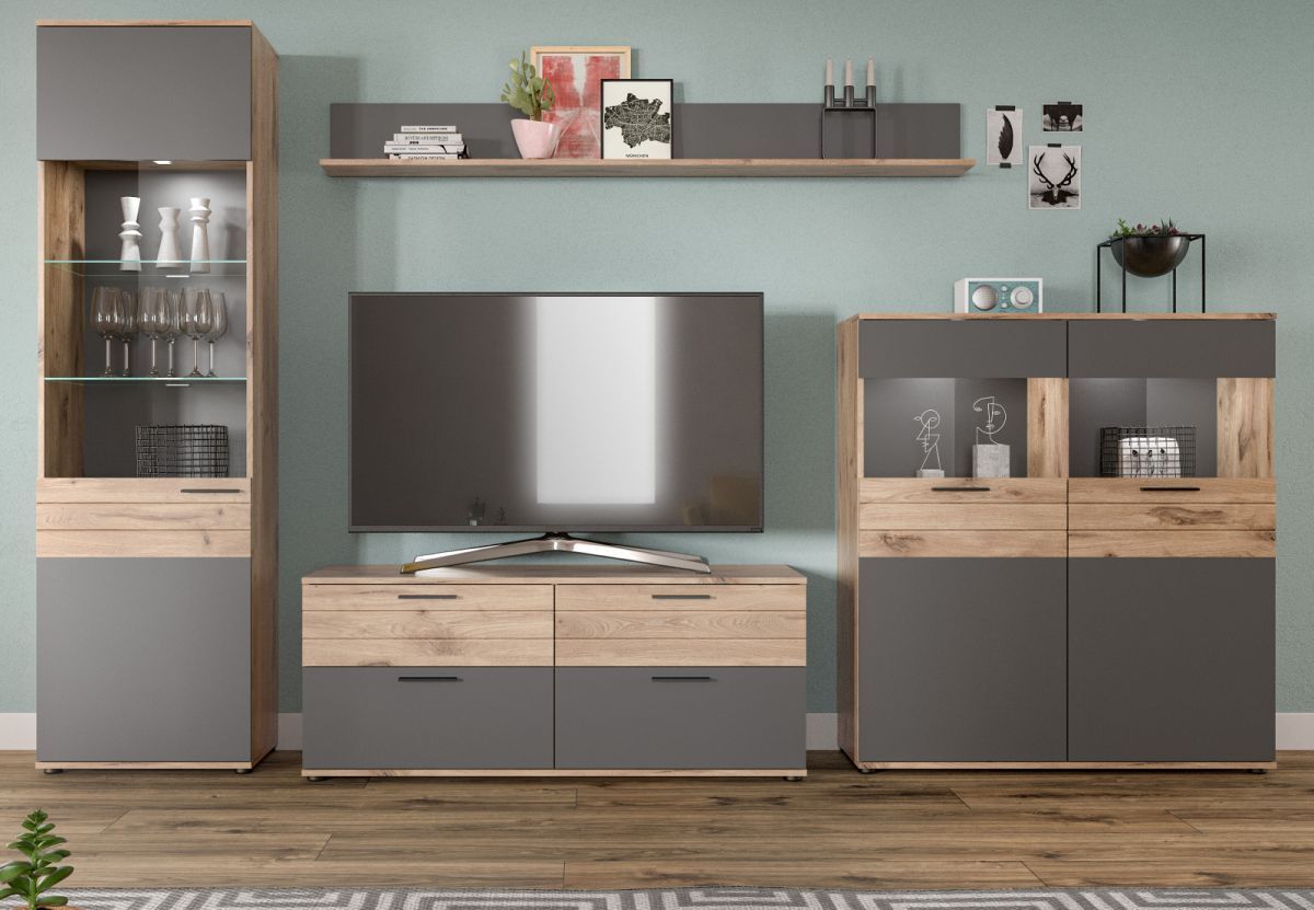 Wohnwand "Tomaso" in Nox Eiche und Basalt grau Wohnkombination 4-teilig 327 x 200 cm