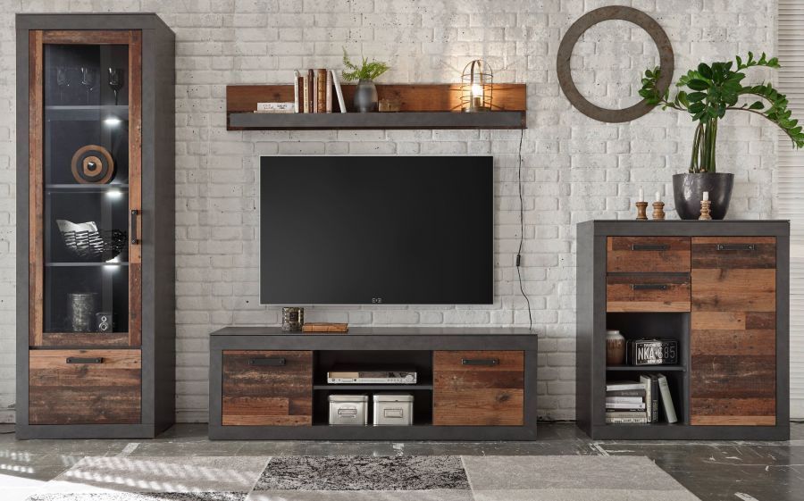 Wohnwand Used Wood grau Wohnkombination 4-tlg Wohnzimmer Schrankwand 330 cm Ward