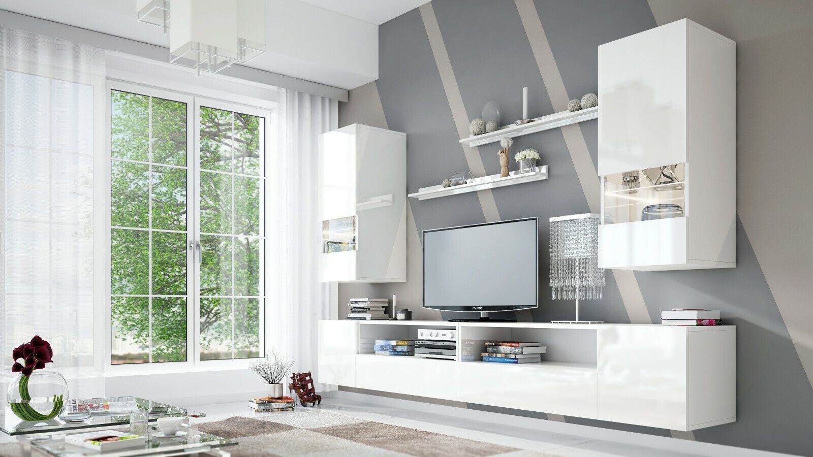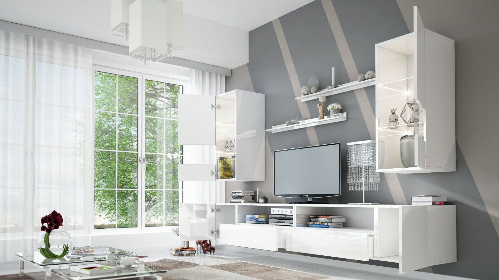 Wohnwand Set VEX 41 in Weiß oder Schwarz Hochglanz Unser Wohnzimmer-Set VEX 41 wird Ihre Wohnung mit ihrem schönen Design optisch aufwerten. Es bietet eine komplette Ausstattung für Ihr Wohnzimmer und macht es zu einem modernen Traum. Das Wohnzimmerset hebt sich durch hoch qualitatives Material und