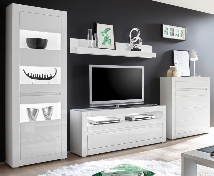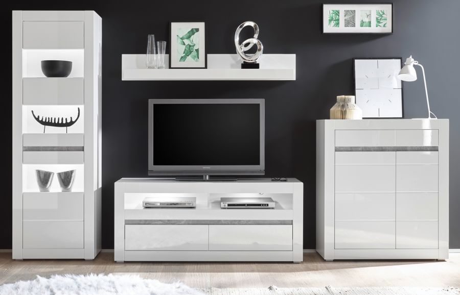 Wohnwand weiß Hochglanz / Stone grau Wohnzimmer Schrankwand Mediawand 336 cm Nobile