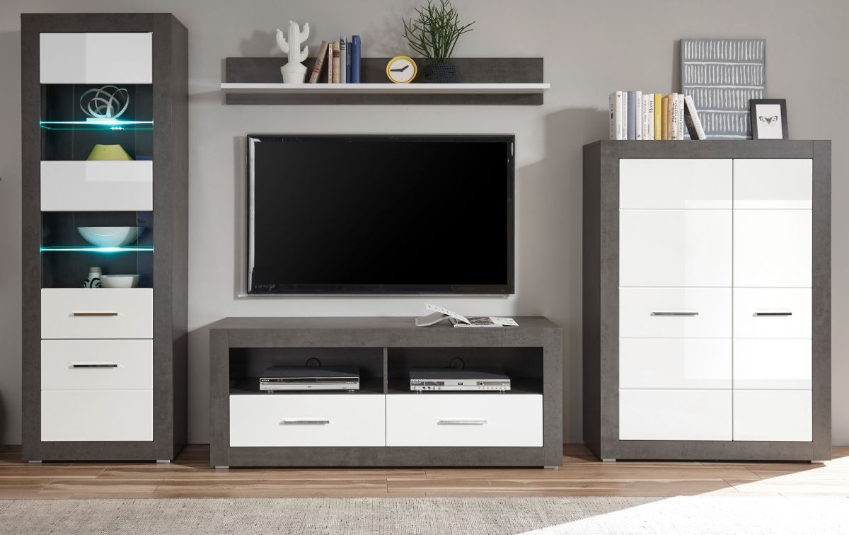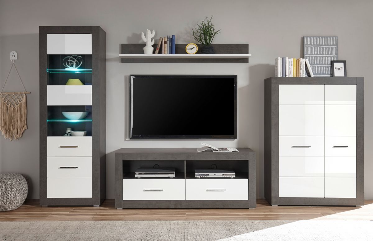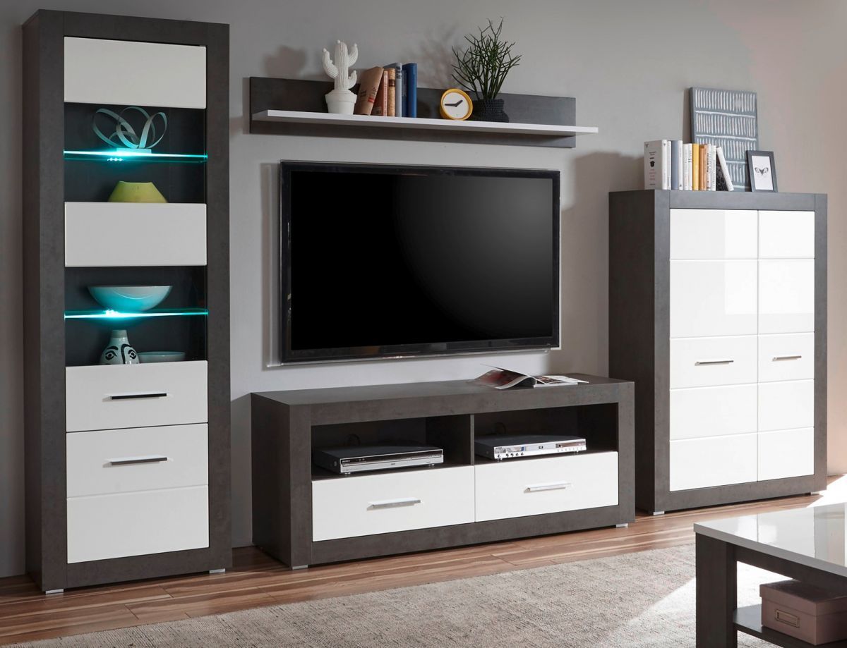 Wohnwand weiß Hochglanz und Stone grau Schrankwand Anbauwand Briard 335 cm