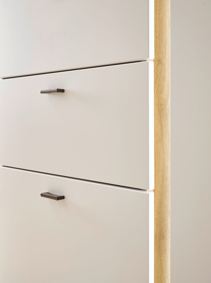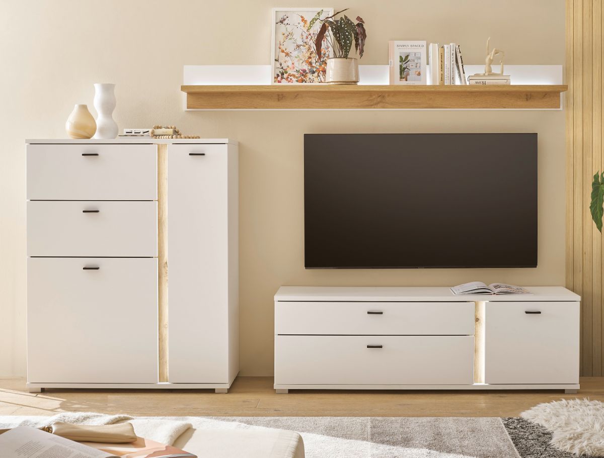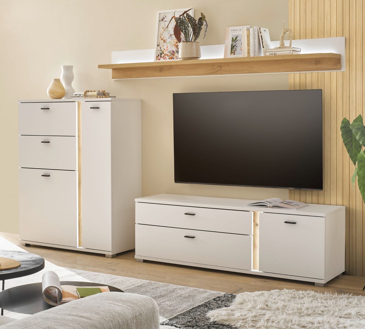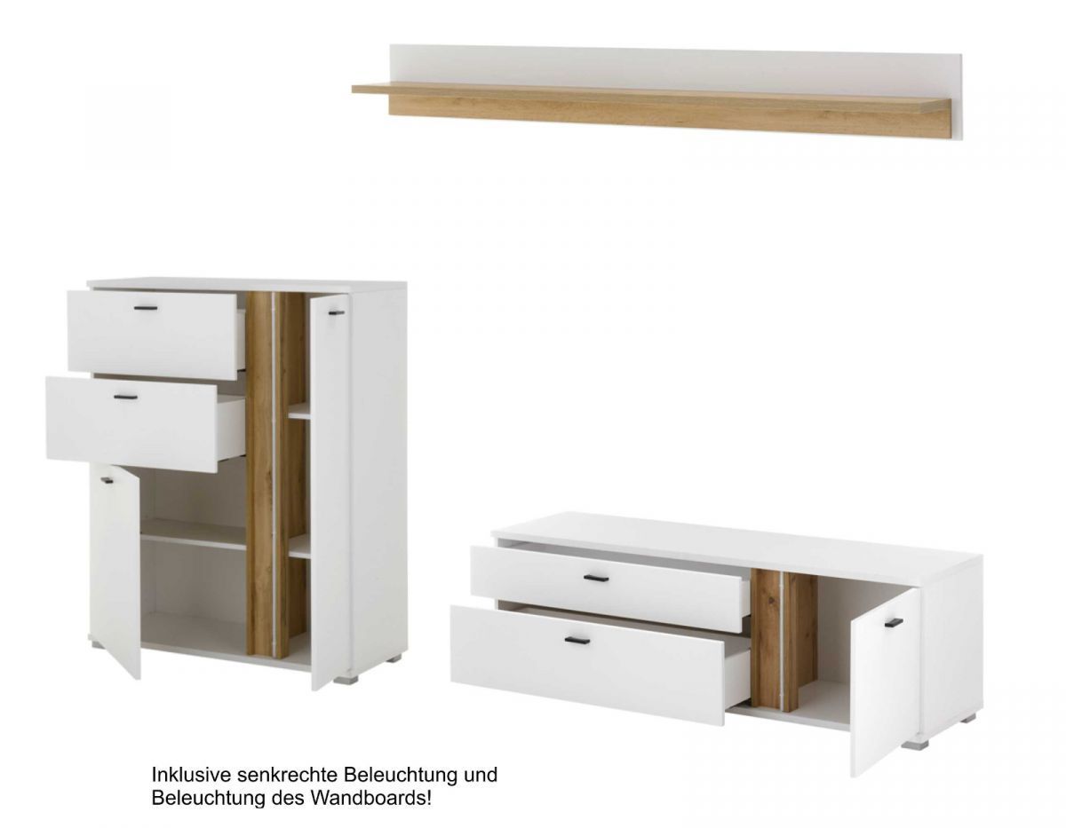 Wohnwand weiß matt Eiche Schrankwand inkl Beleuchtung Soft-Close Set 3-tlg Bellport