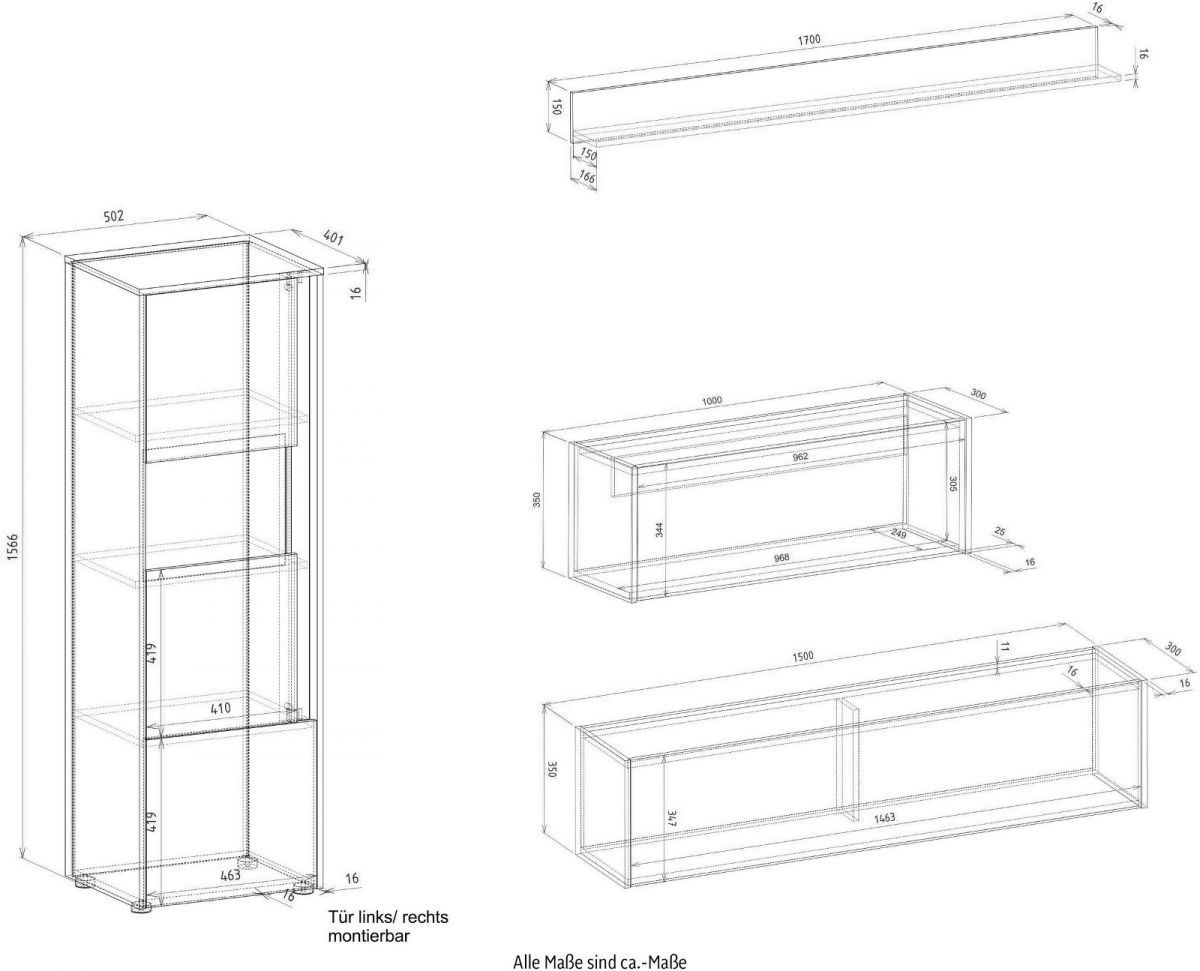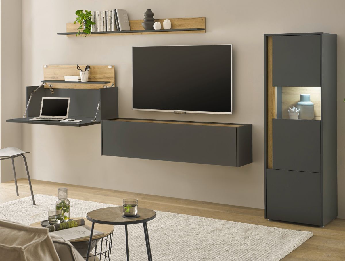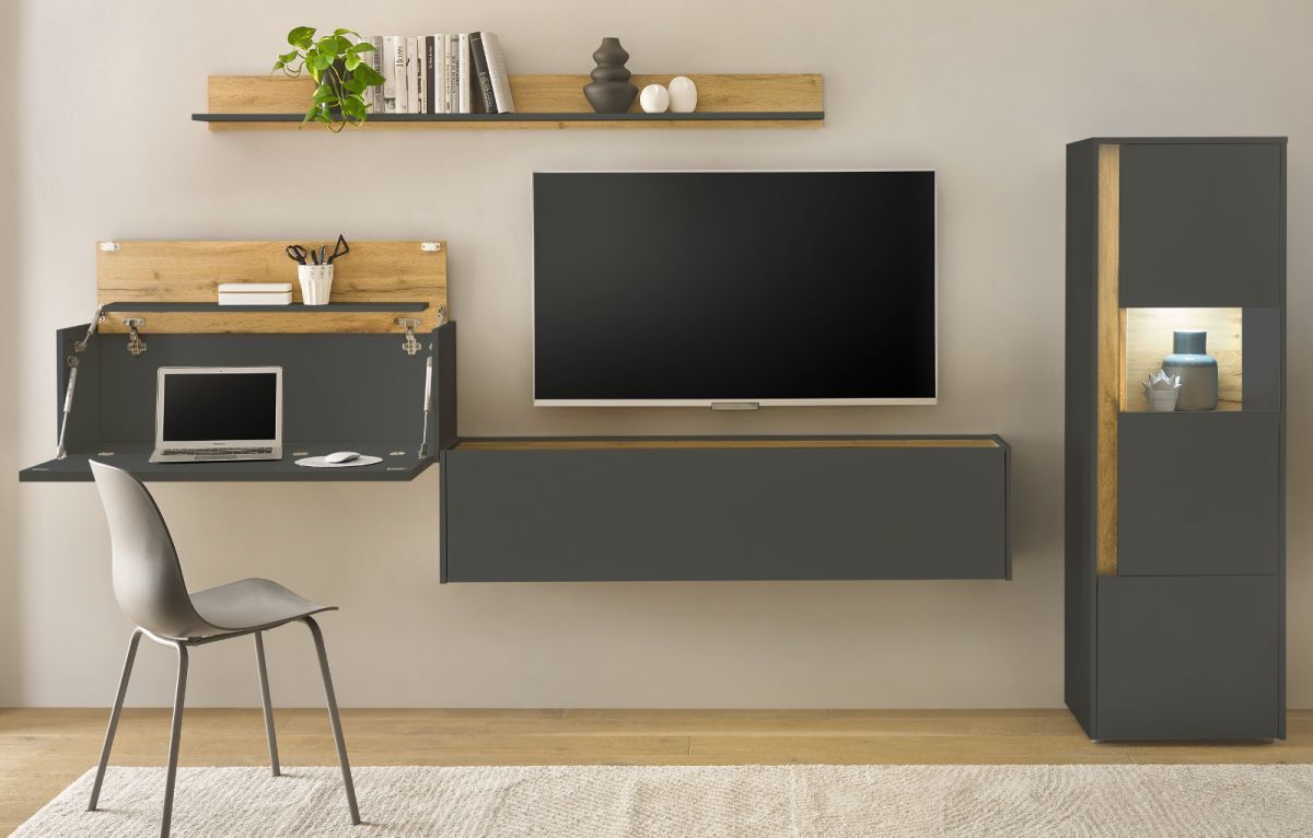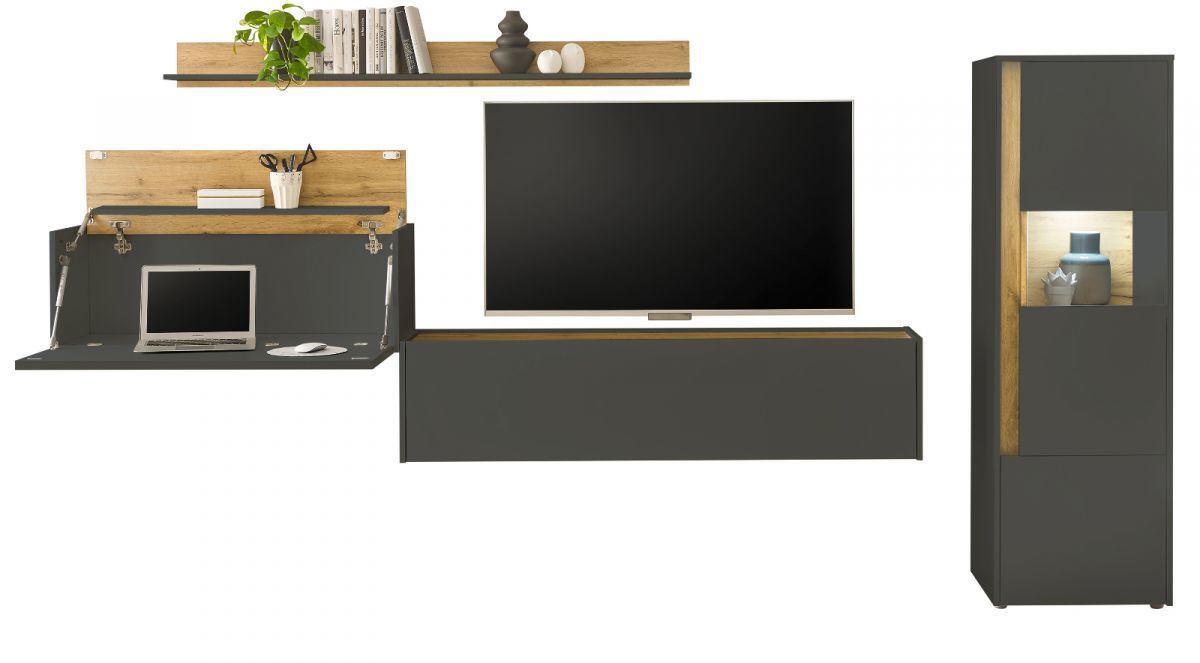Wohnwand Wohnzimmer Schrankwand mit Sekretär in grau Wotan Eiche 320 cm Center