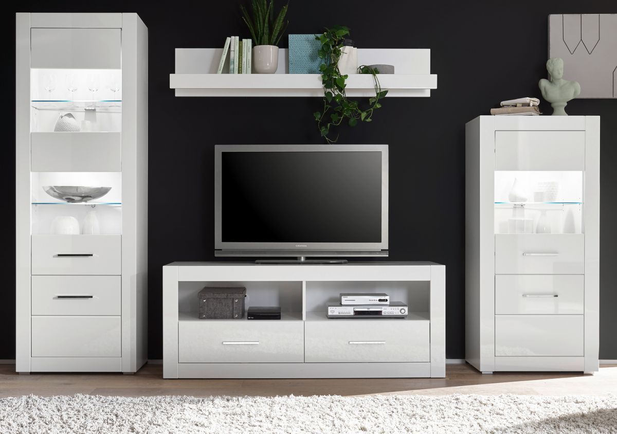 Wohnwand Wohnzimmer Schrankwand weiß Hochglanz Set mit Vitrine 300 cm Carrara