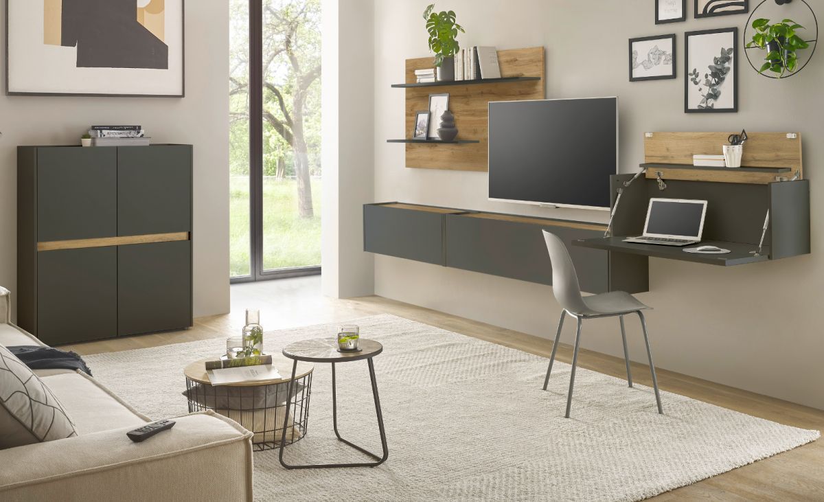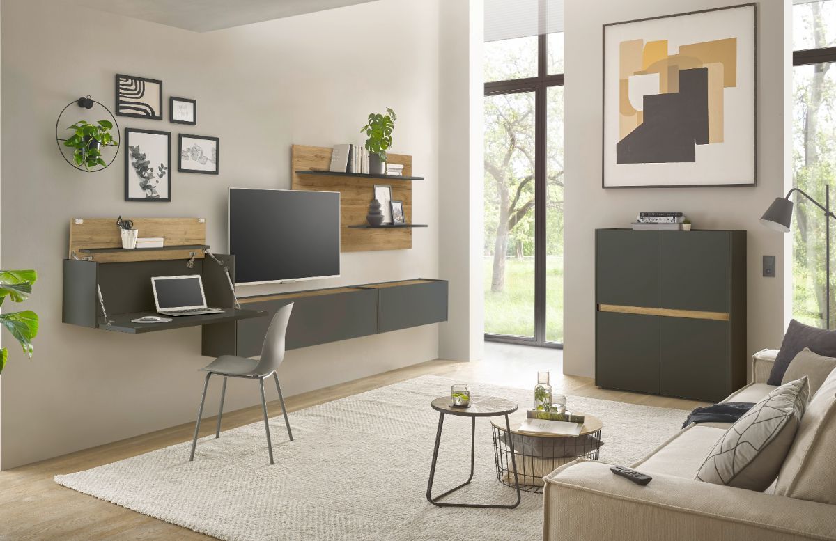 Wohnwand Wotan Eiche grau Wohnzimmer Set Sekretär und TV-Lowboard 5-tlg. Center