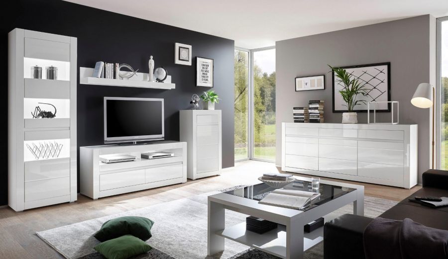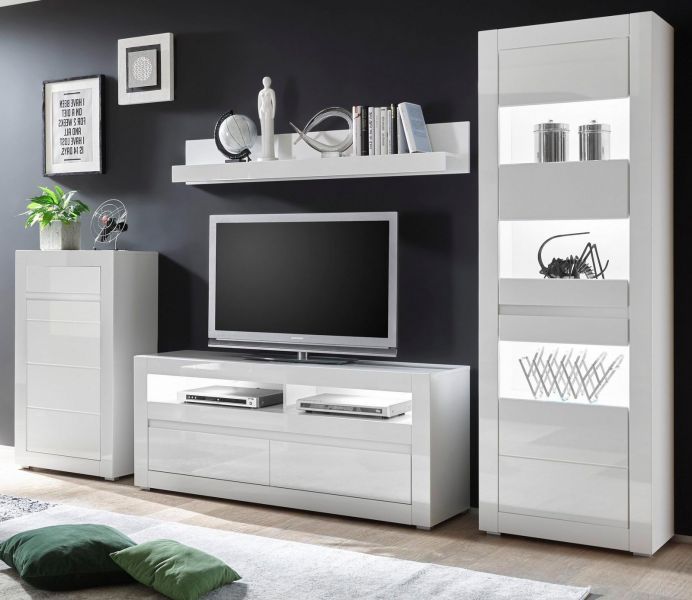 Wohnzimmer Möbel Wohnwand weiß Hochglanz und Stone grau Schrankwand Nobile 300 cm
