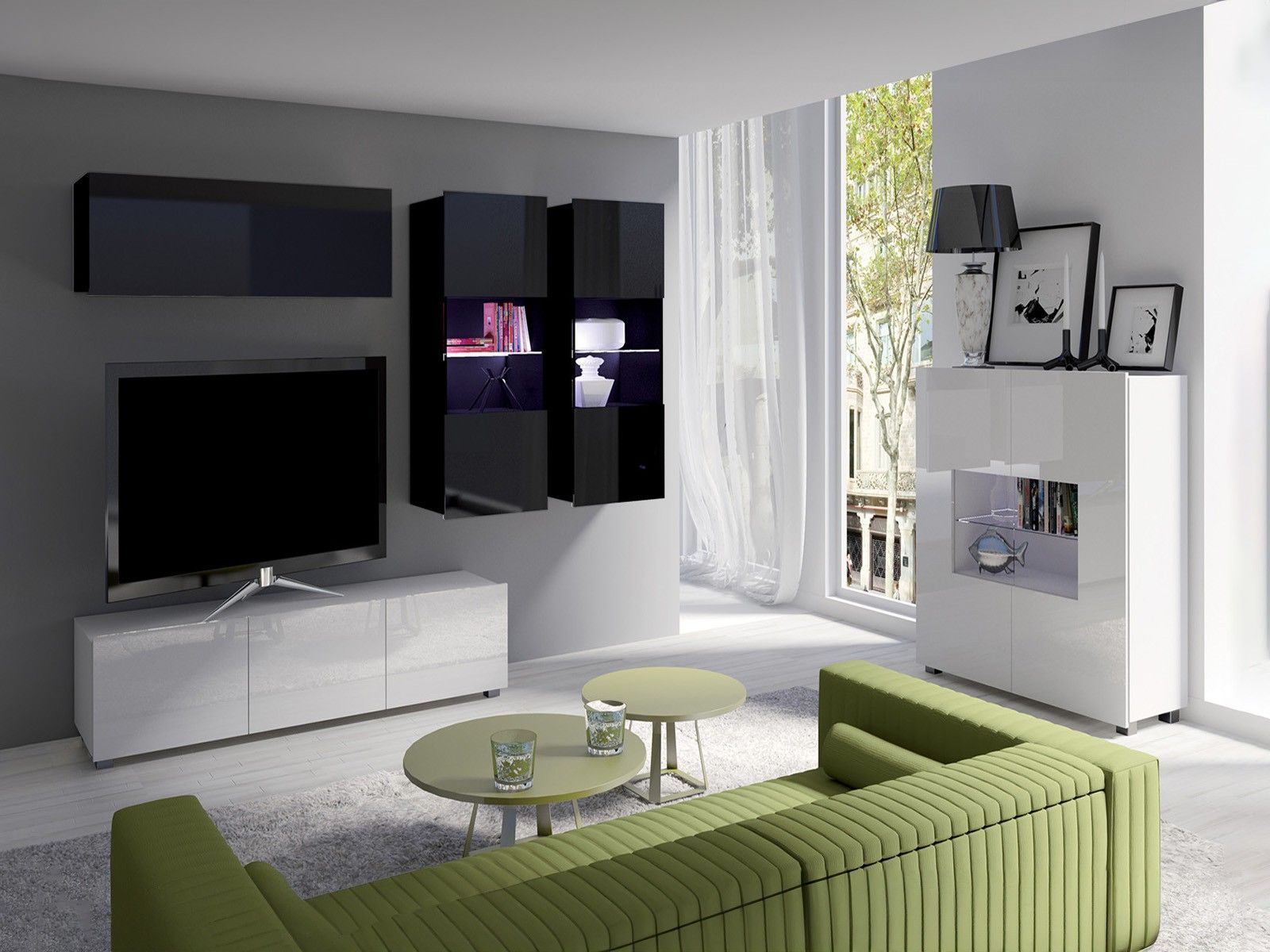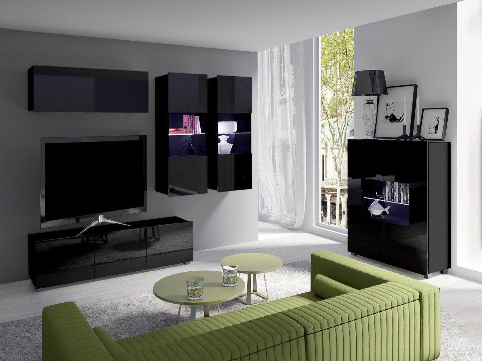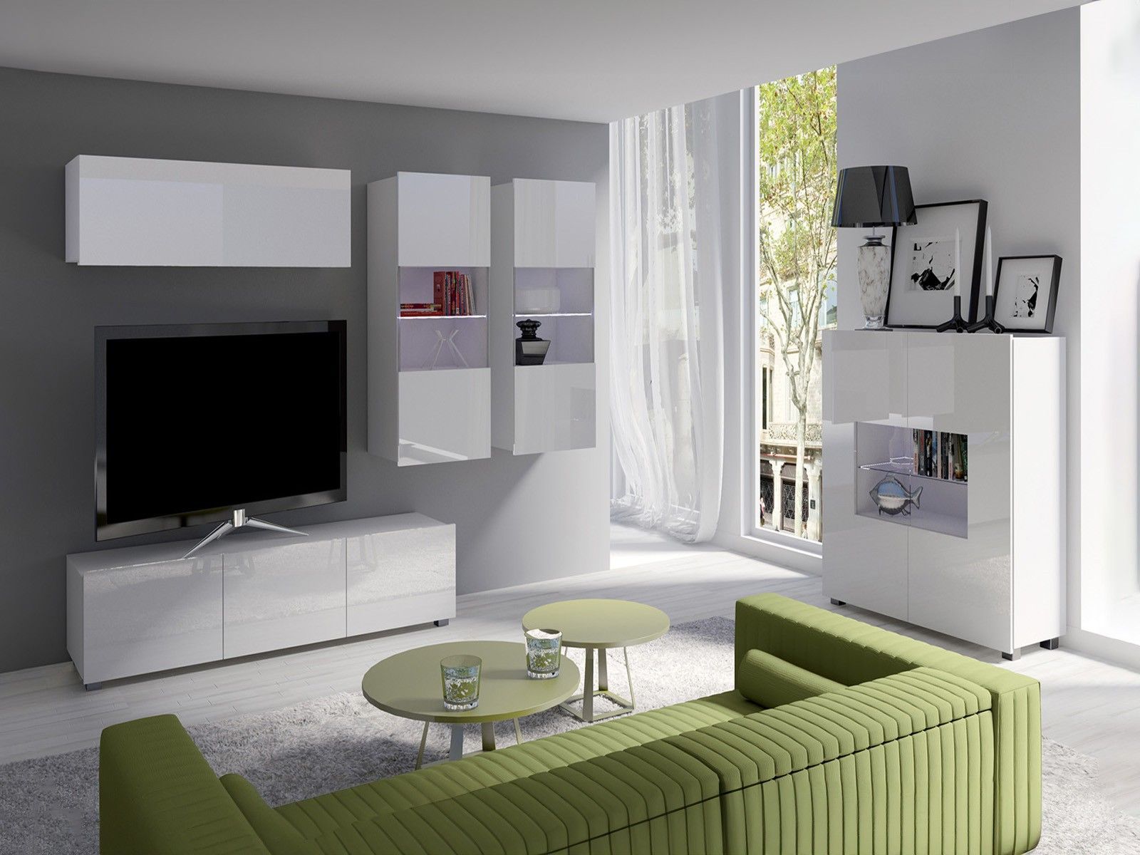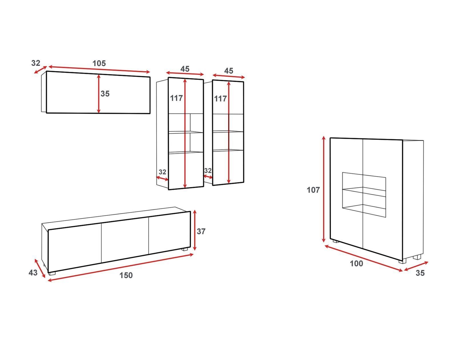 Wohnwand CALABRINI-6 ABS-Kanten gehärtetes Glas Rückwände aus HDF-Platte silberne Beine aus Kunststoff grifflose, vorstehende Fronten teilweise hochglänzend (nur Fronten) Fronten aus laminierter Spanplatte 16 mm Korpus aus laminierter Spanplatte 16 mm LED-Beleuchtung 5-teilig Spezifikation Maße Vitr