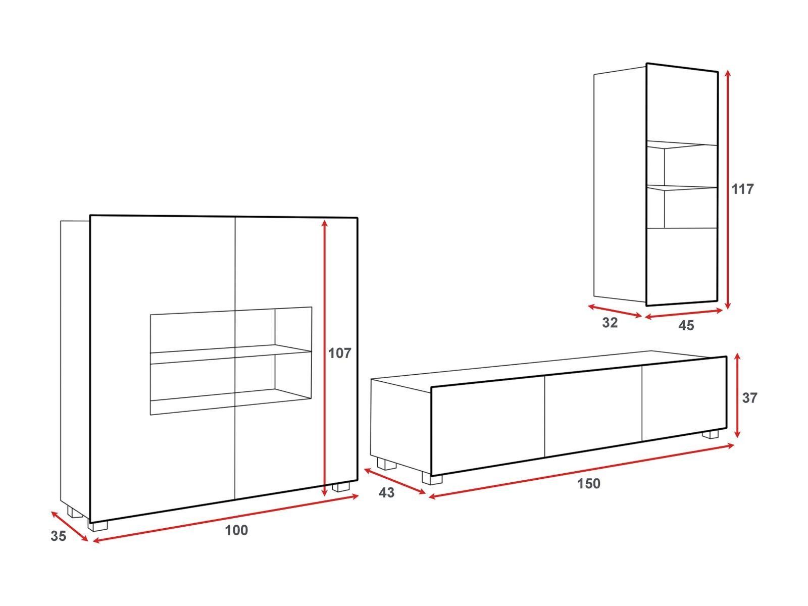 Wohnwand CALABRINI-07 Korpus: Spanplatte laminiert 16 mm, Fronten: Spanplatte laminiert in Hochglanz 15 mm, PVC-Furnier, ohne Griffe 5 cm silberne Füße optional teilweise hochglänzend (Fronten Weiß und Schwarz) 3-teilig ABS-Kanten Rückwände aus HDF-Platte LED-Beleuchtung Spezifikation Maße Vitrinens