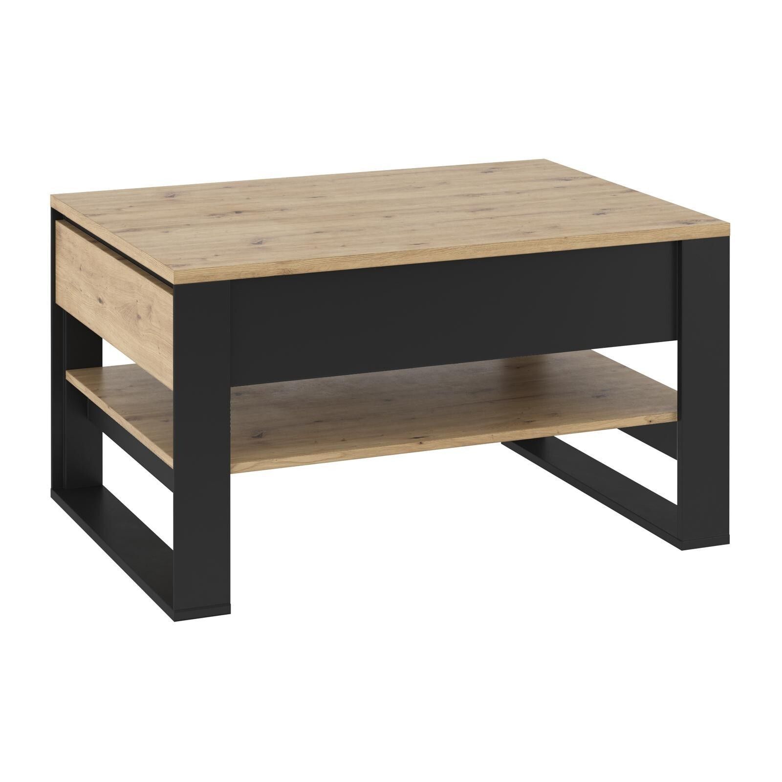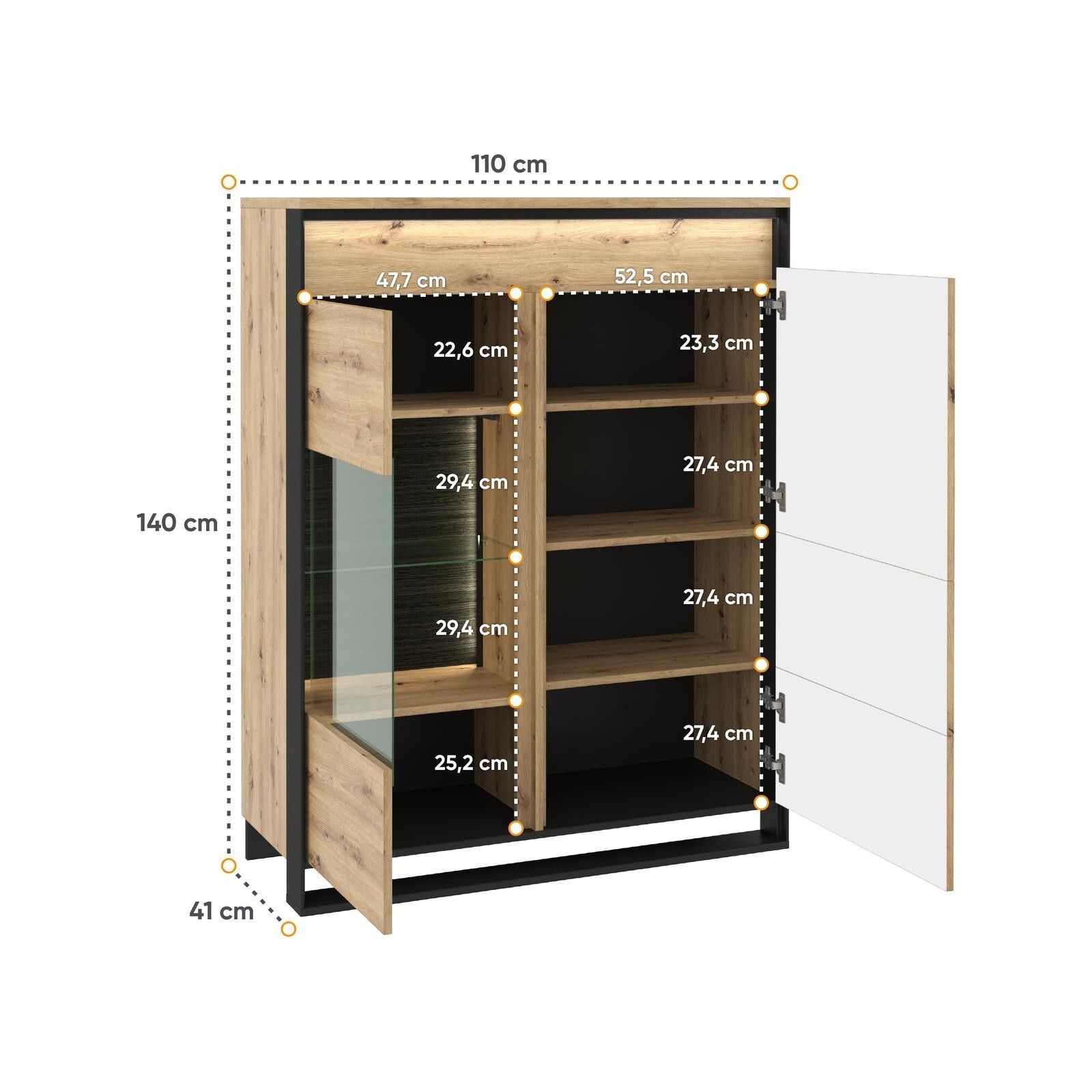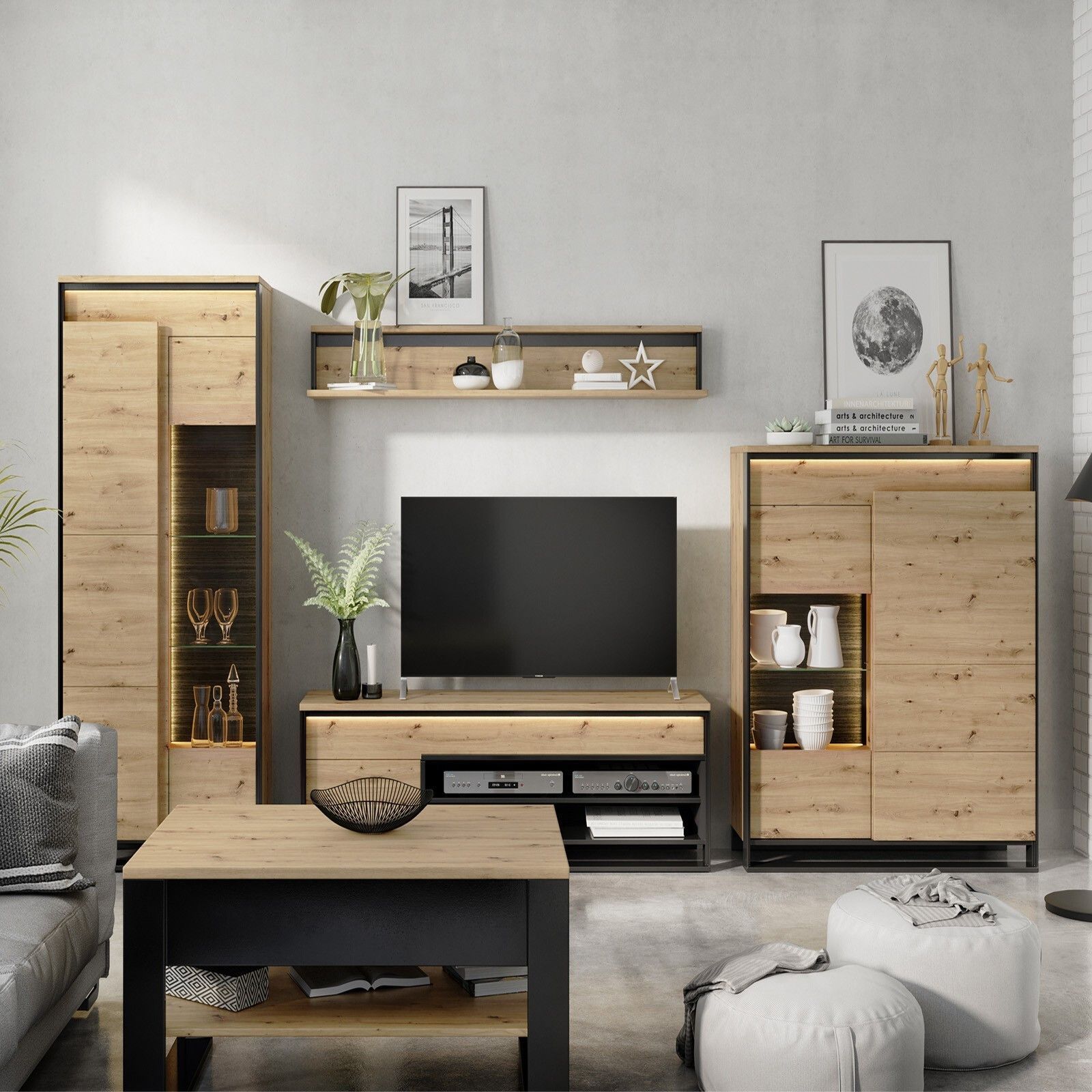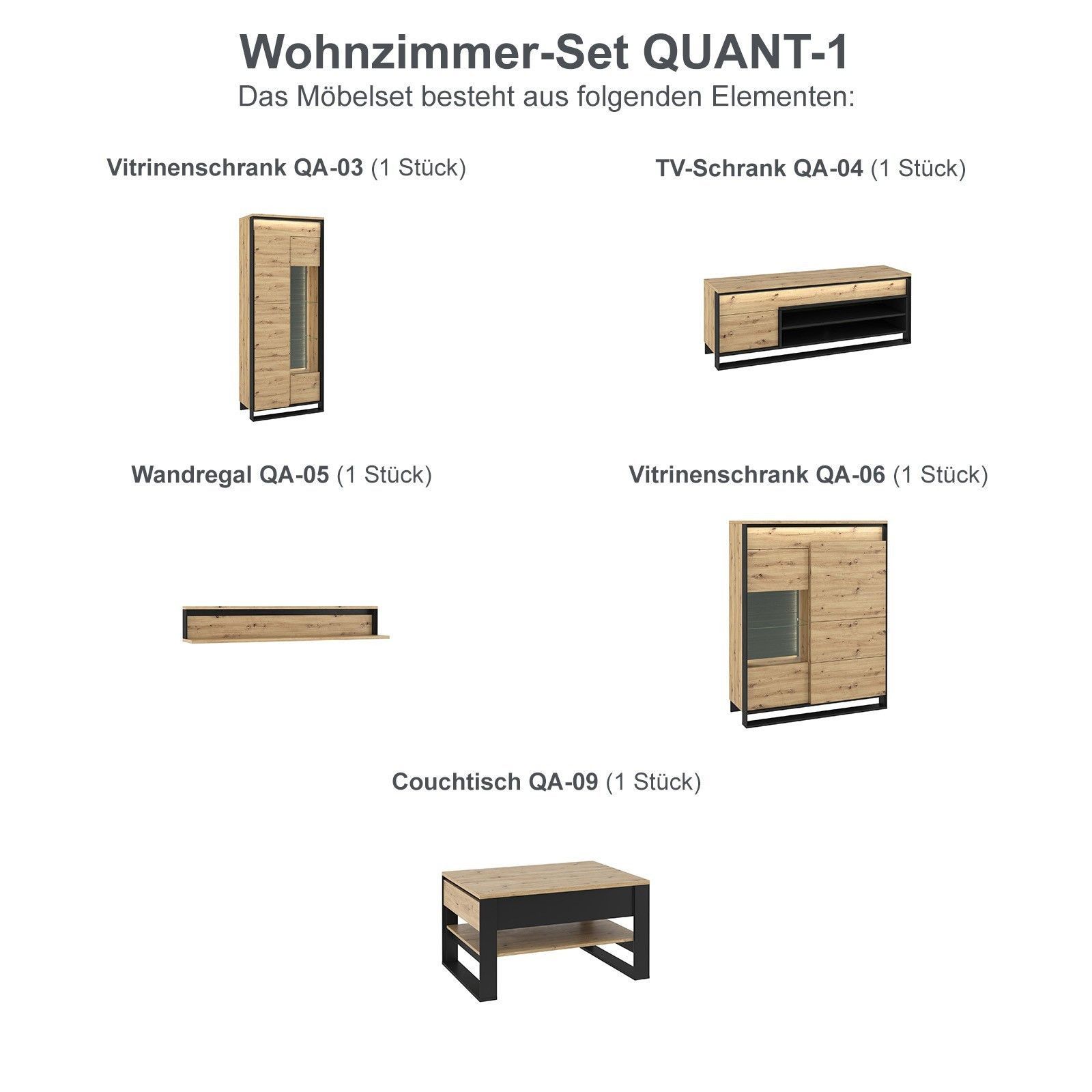 Wohnzimmer-Set QUANT-1 Vitrinenschrank TV-Schrank Wandregal Couchtisch Die QUANT Möbelkollektion ist eine moderne, elegante Serie, die einen interessanten Loft-Stil mit hoher Funktionalität vereint. Mit zeitlosen Farben - Holz und klassischem Schwarz behalten die Möbel ihren einzigartigen Charakter,