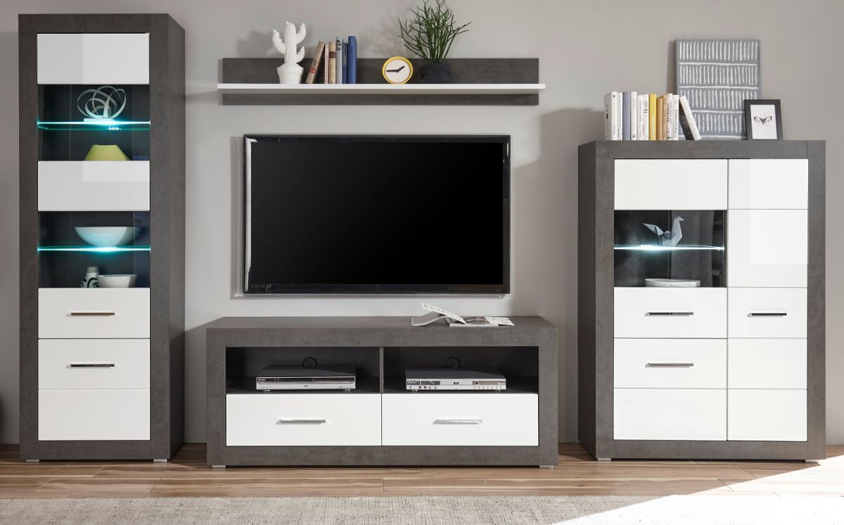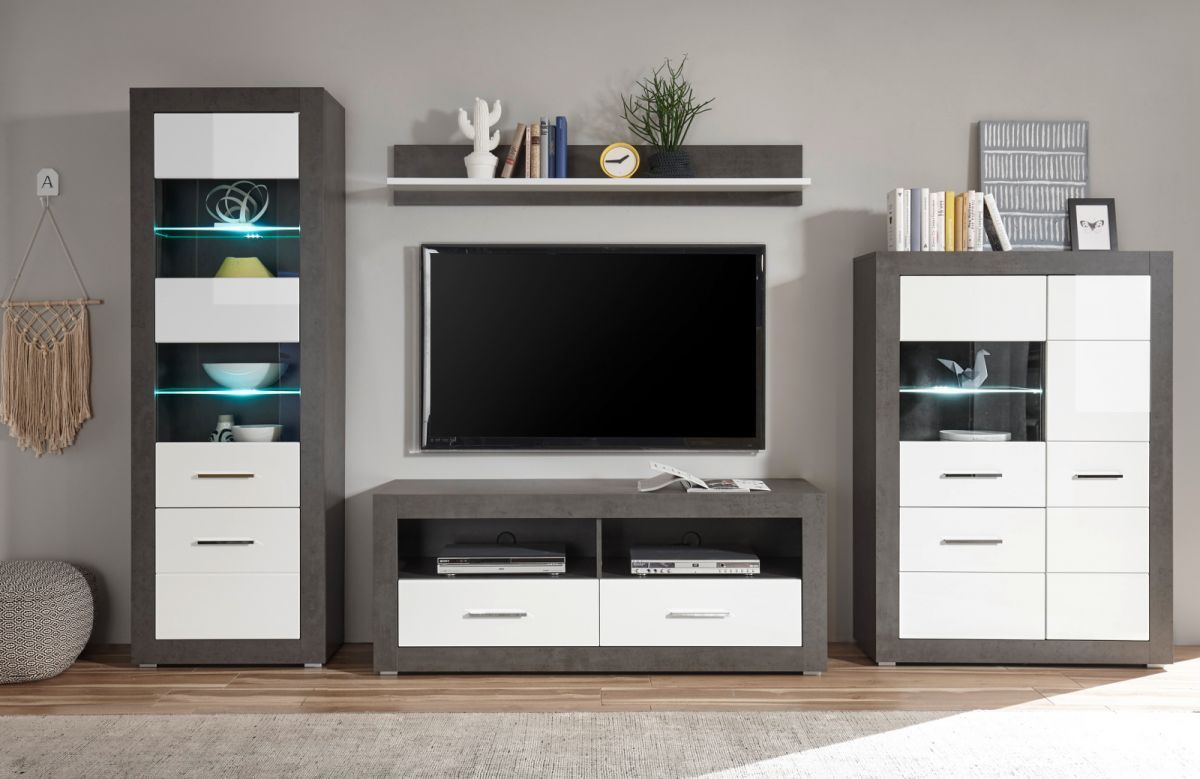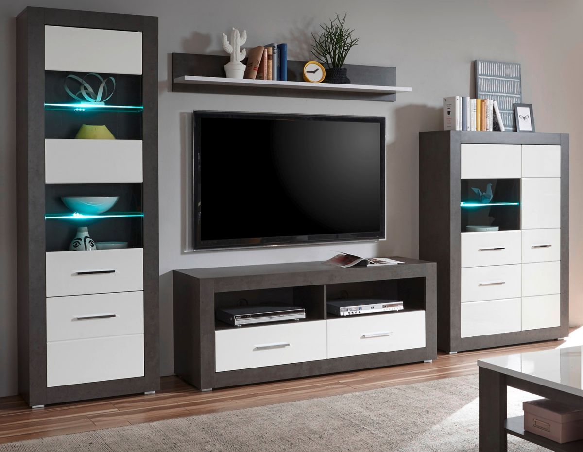 Wohnzimmer Wohnwand weiß Hochglanz grau Schrankwand mit Lowboard Briard 335 cm