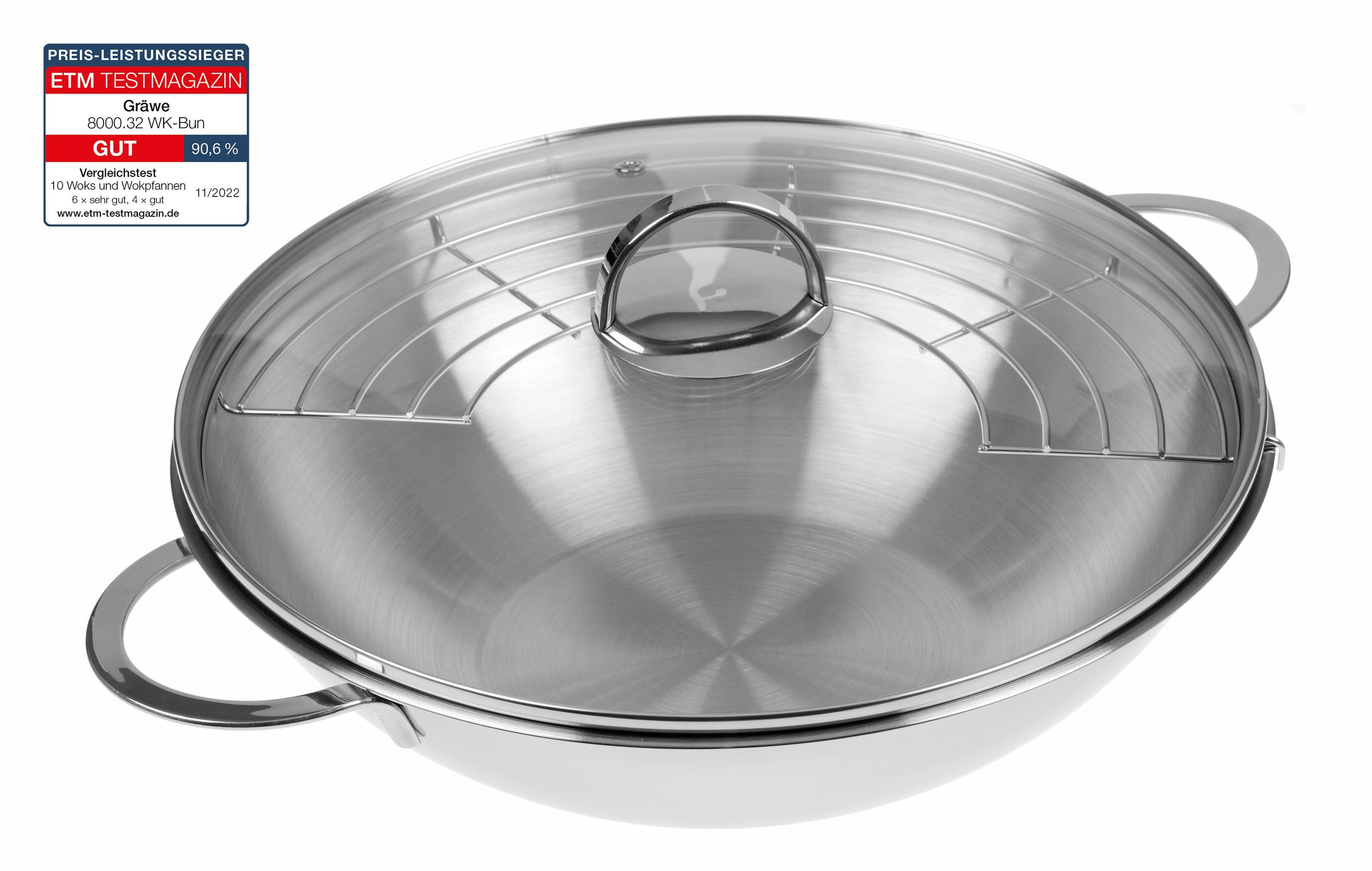GRÄWE Wok 32 cm mit Glasdeckel und Ablagegitter, Serie Pro-Line
