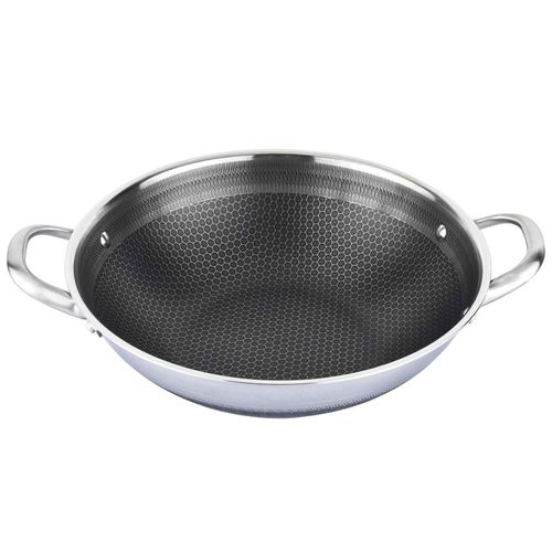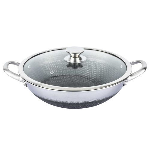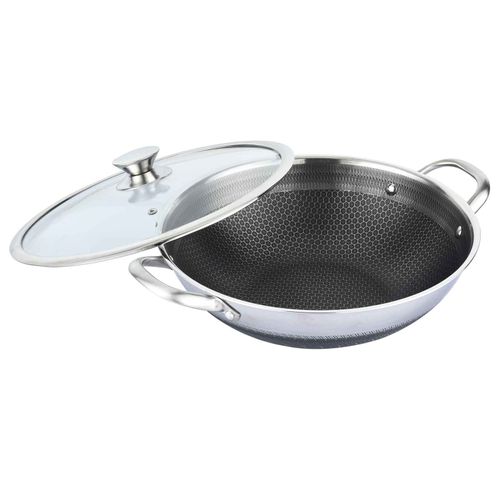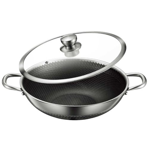 Wok Bratpfanne Edelstahl mit Antihaft Wabenstruktur Wokpfanne mit Glasdeckel Asia