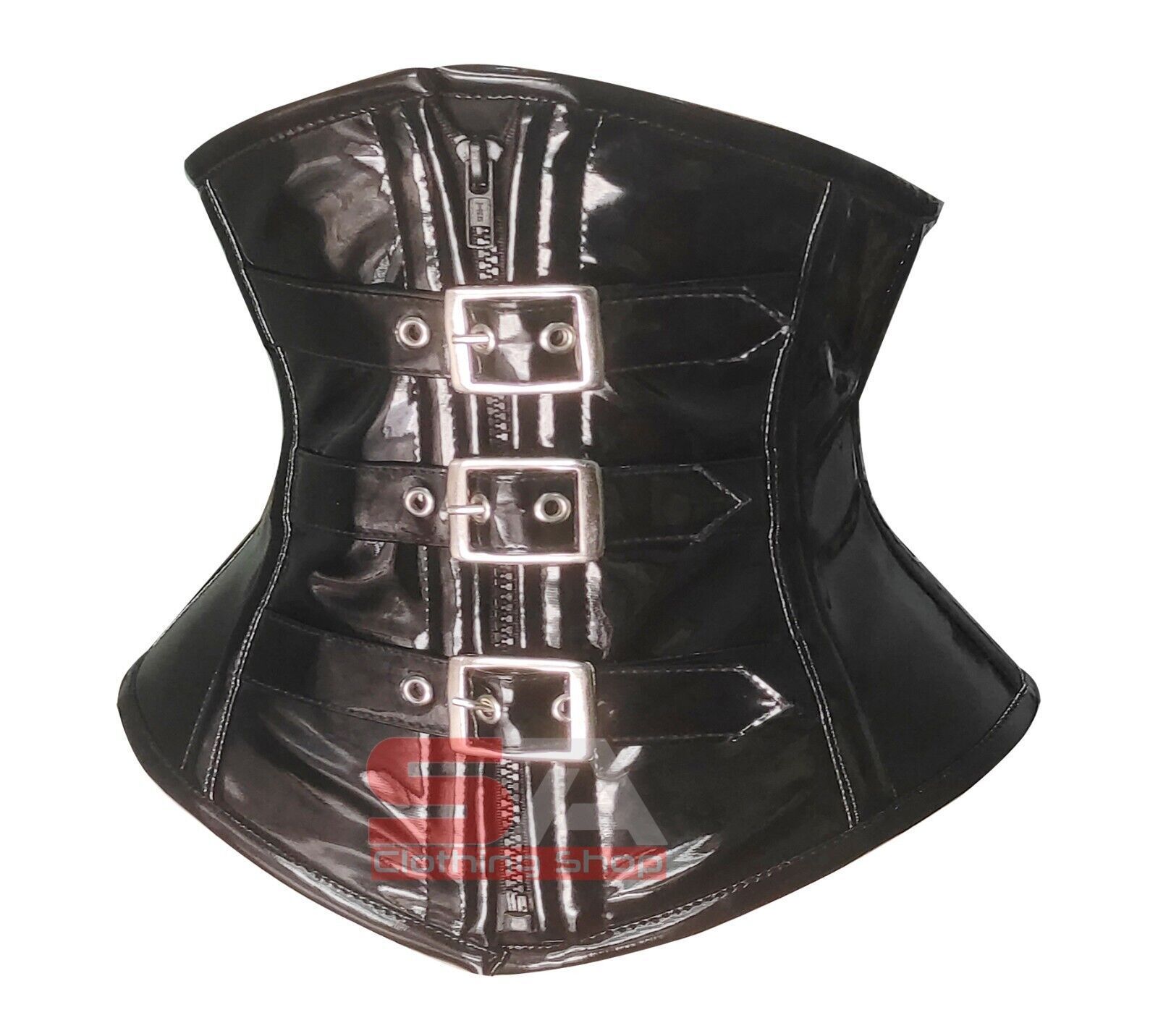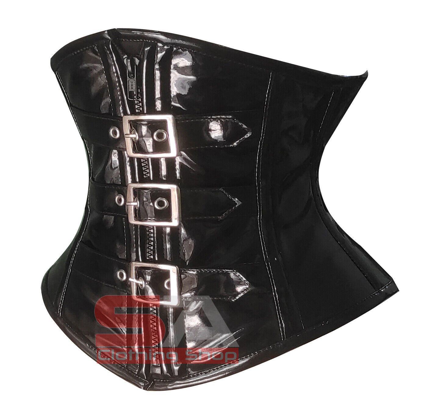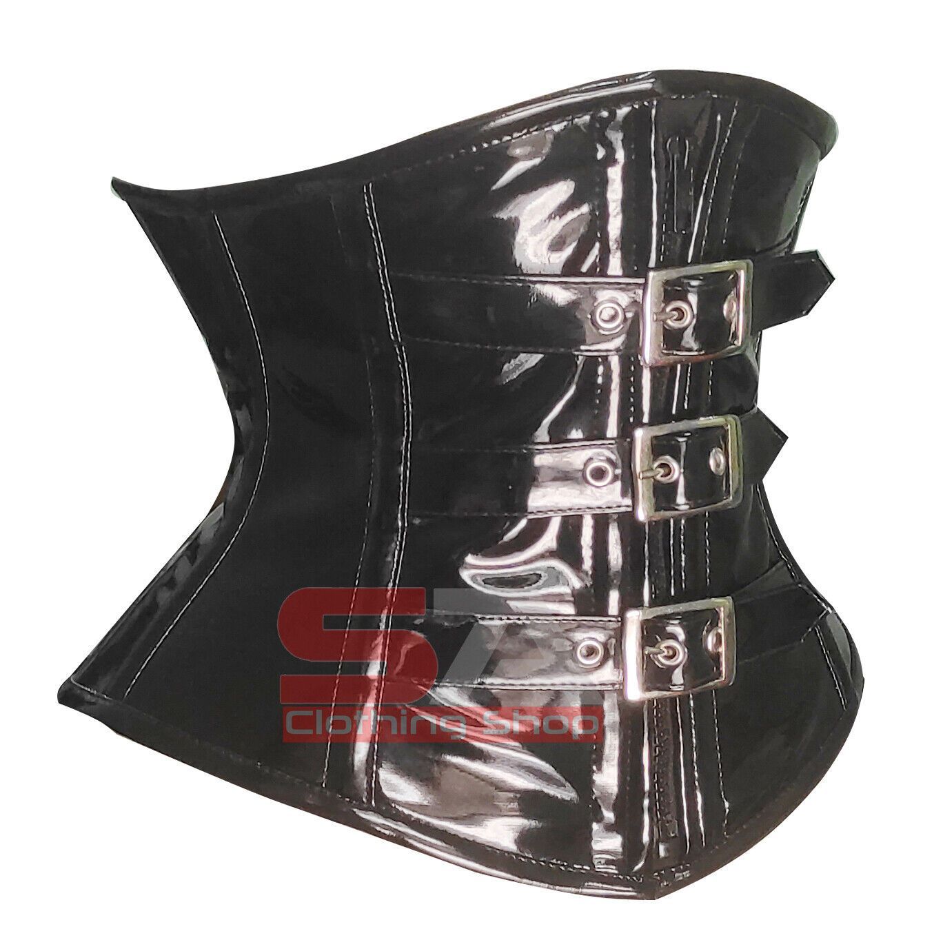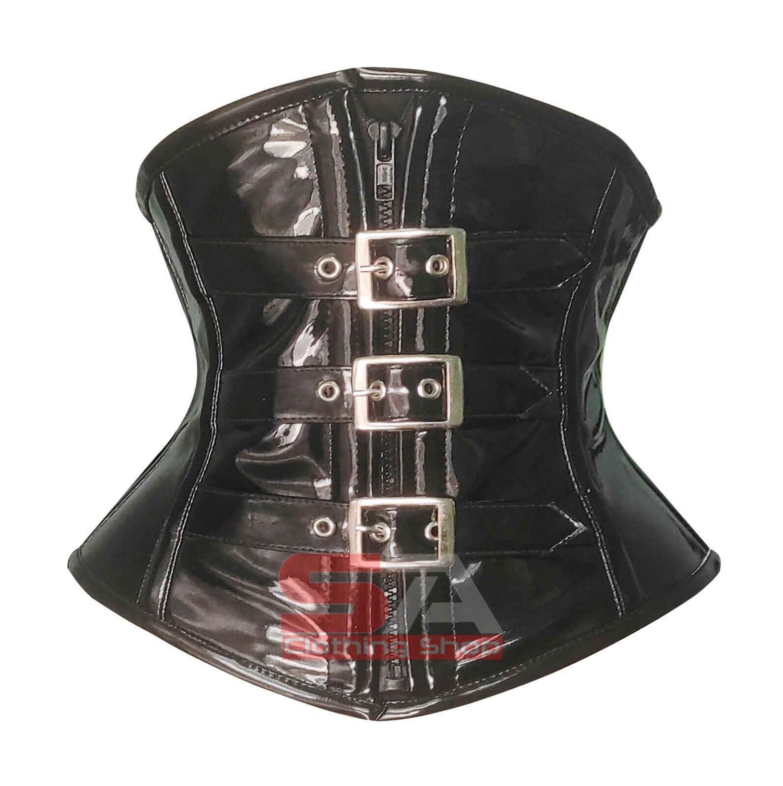 Women Underbust Black PVC Vinyl Steel Boned Waist Cincher Corset Korsette 8401