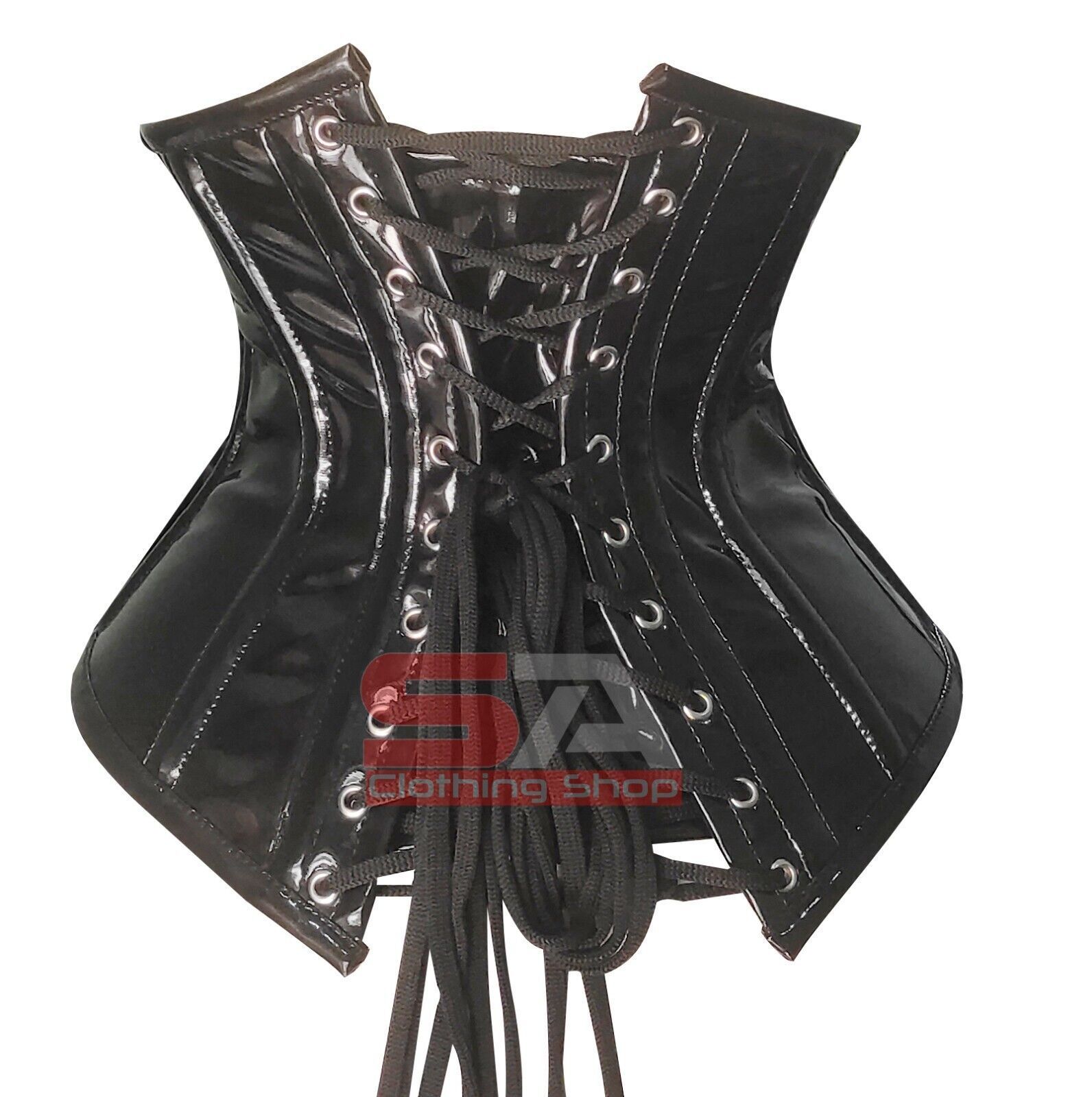 Description Corset Detail Outer Shell: PVC Vinyl Inner Shell: 100% Cotton Twill Underwired: 100% Steel Bones Closure: Rust free metal claps Corset Front Length: 10.5 Corset Side Length: 8 Corset Back Length: 10.5 5 Modesty Panel at the back Corset Features Heavy Duty, Very Strong Fully Steel Boned C