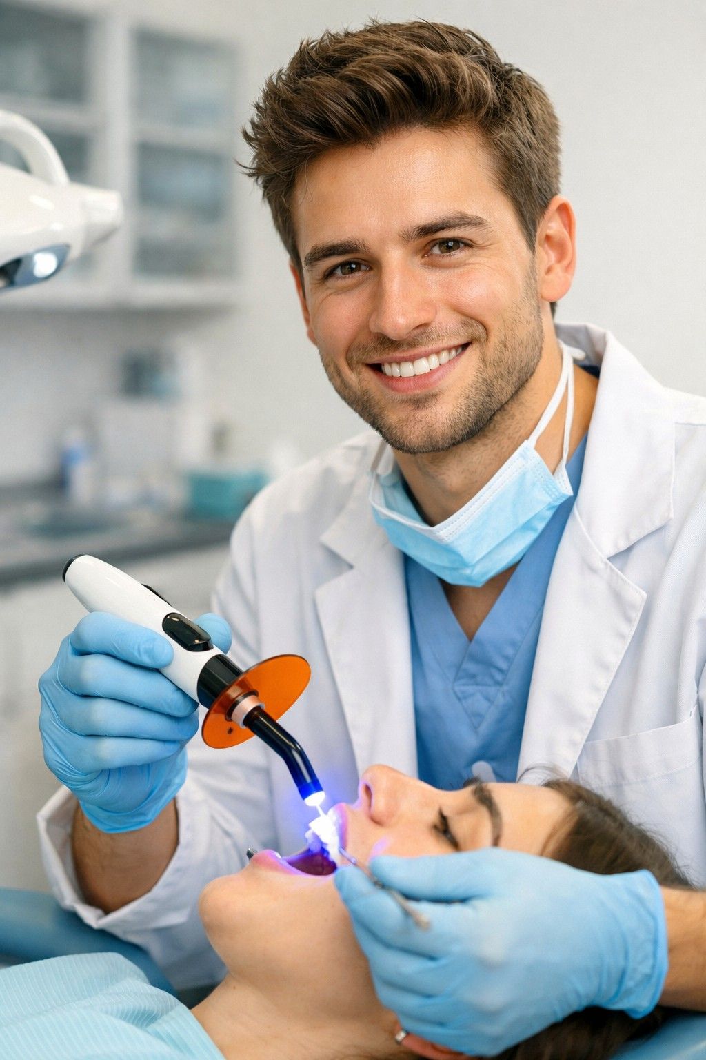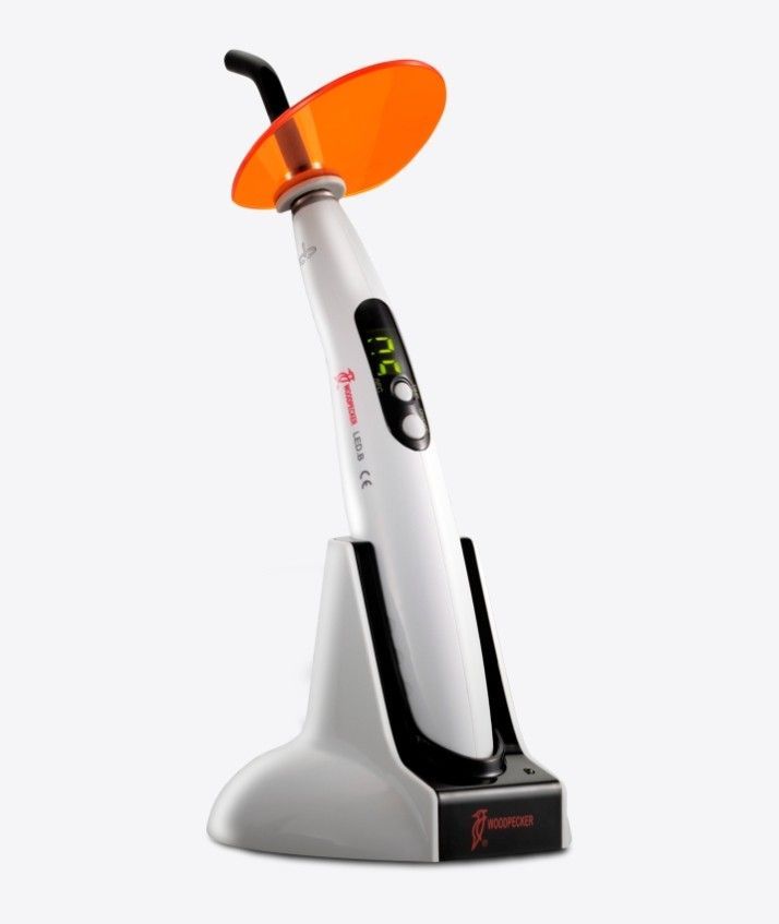 Leistungsstarke Woodpecker LED.B Polymerisationslampe mit 1.000–1.600 mW/cm², flexiblen Zeiteinstellungen und ergonomischem Design für Zahnarztpraxen.