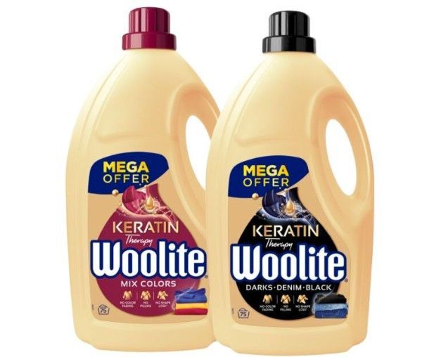 Woolite Keratin Therapy 2x4,5L - Every time you wash your clothes, they are subjected to friction, which leads to loss of shape, fading, and pilling. Protect your garments from damage with Woolite Keratin Therapy, a keratin-enriched detergent with a keratin formula that forms a protective layer agai