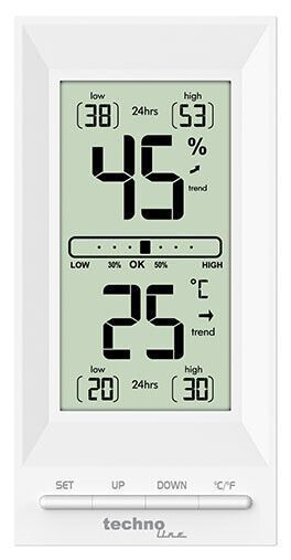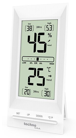 WS 9129 technoline Thermo-Hygrometer mit Komfortanzeige Innentemperaturanzeige in °C oder °F Innenluftfeuchteanzeige Kalibrierungsfunktion für Temperatur und Luftfeuchtigkeit MIN MAX Speicherung (24 Stunden oder dauerhaft) Temperatur- und Luftfeuchtigkeitstrend Raumkomfortanzeige Batterieendanzeige
