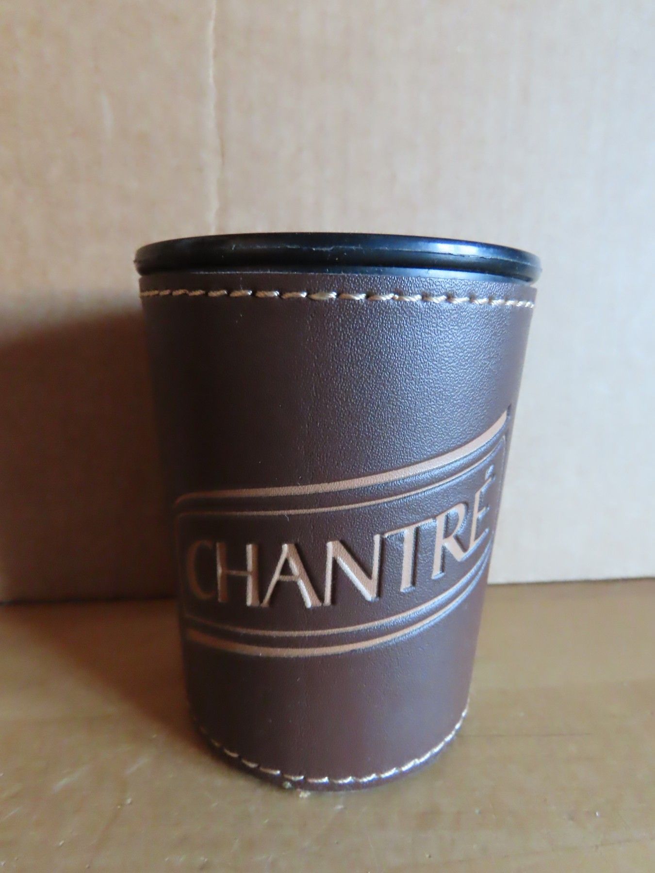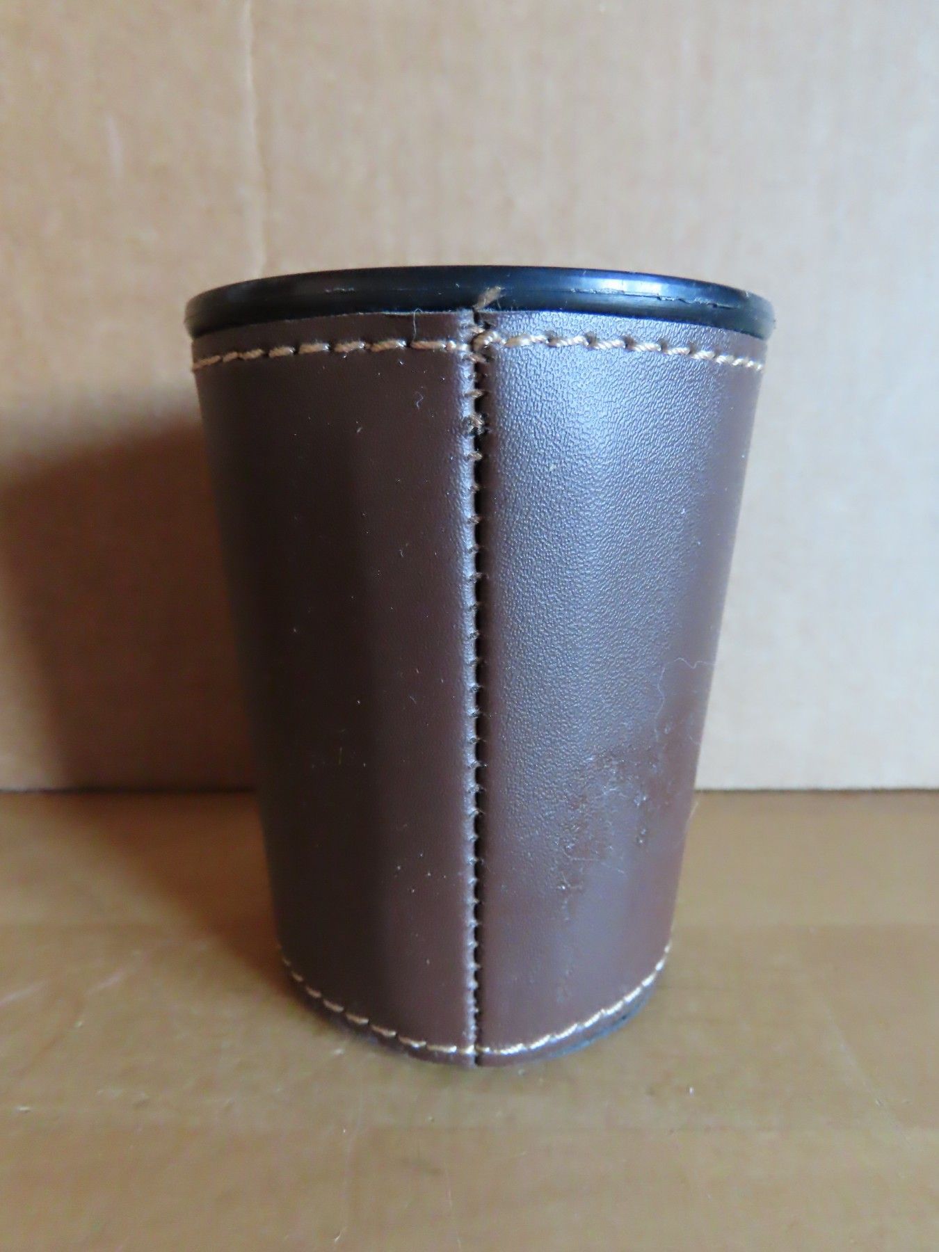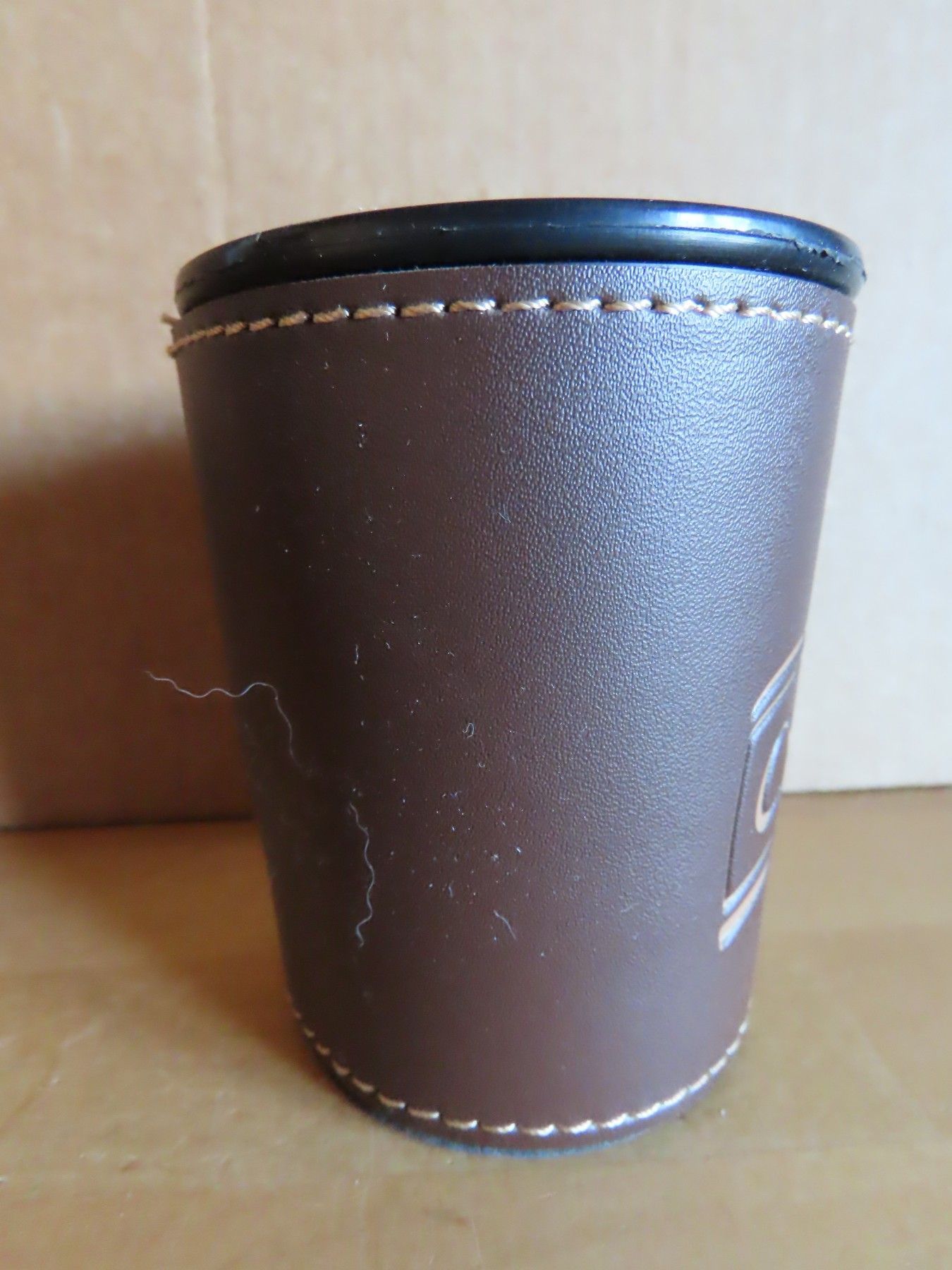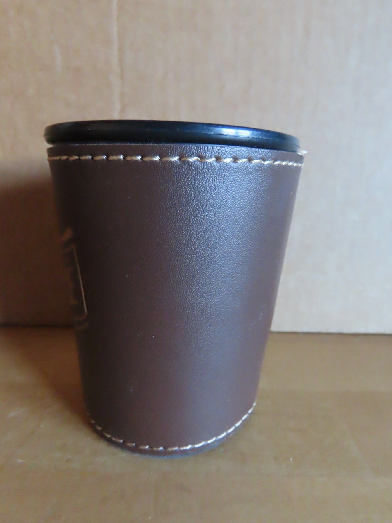 Maße : ca. 7,4 cm Durchschitt , ca. 9 cm hoch ----immer an der breitesten Stelle gemessen Standfuß hat einen Durchmesser von ca. 6 cm Material: Kunstleder und Plastik innen die Pappe hat sich gelöst... Mehr