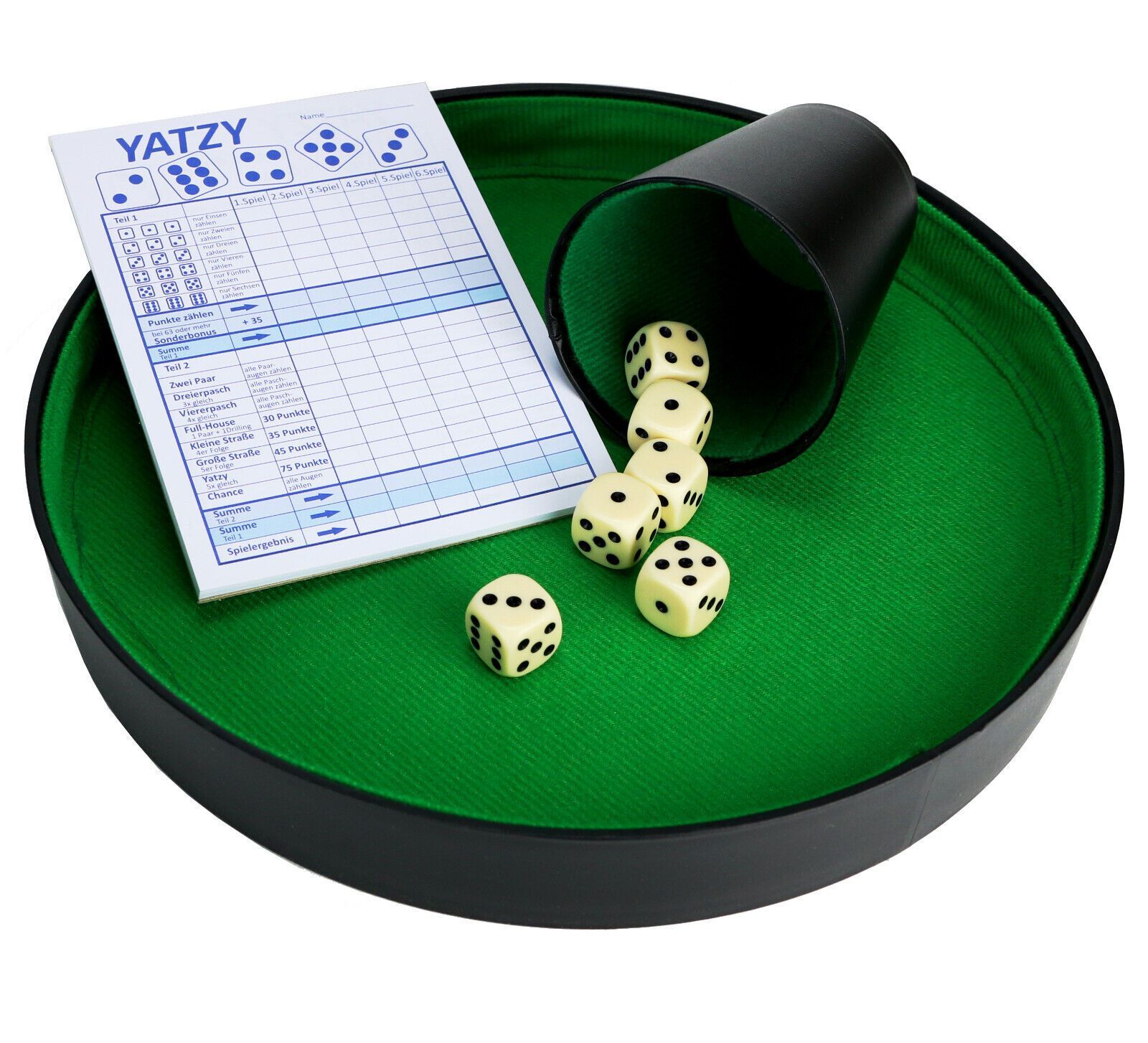 Würfelteller Set mit Würfelbecher 6 Würfel & Yatzy Block Würfelunterlage Brett
