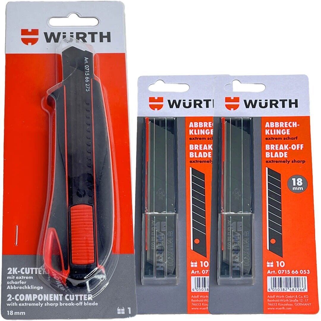 2x Würth 2K Cuttermesser 18mm + 6 Klingen extrem scharf Teppichmesser 071566275