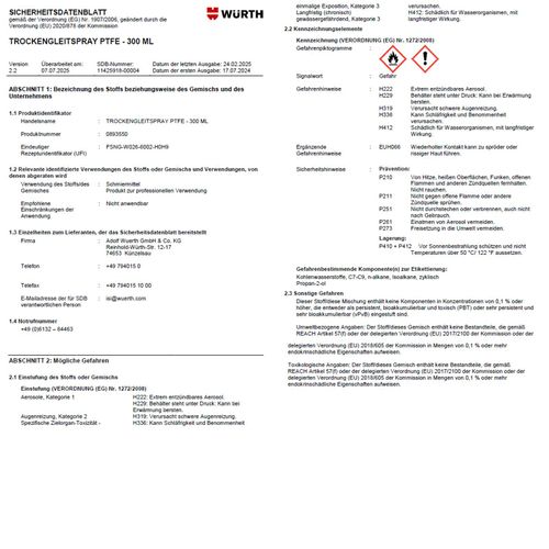 WUERTH Trockengleitspray PTFE 0.3 LTR Verschleissschutz wasserbeständig