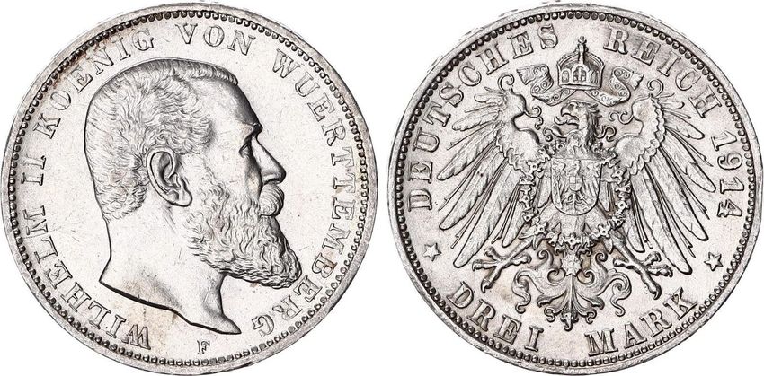 Württemberg Silbermünze 3 Mark 1914 F, König Wilhelm II. (1891-1918)
