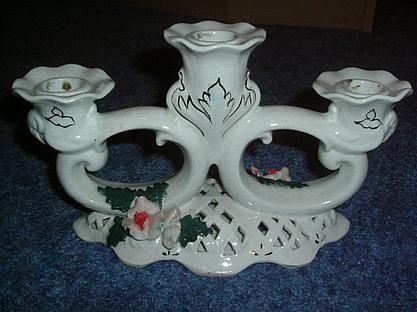 Biete in dieser Auktion an: wunderschöner alter Leuchter für 3 Kerzen mit Durchbrucharbeiten und aufgesetzten Rosen Breite bis 12cm , Höhe 13cm Artikel war im Gebrauch, hat keine Abplatzungen, in der Lasur gleichmäßig viele kleine Risse Da ich viele weitere Artikel im Angebot habe, schaut einfach ma