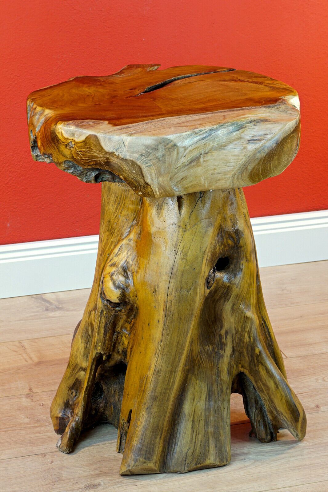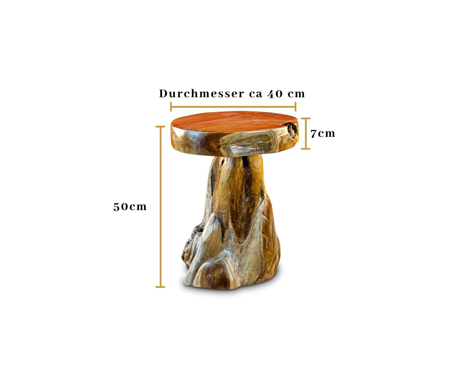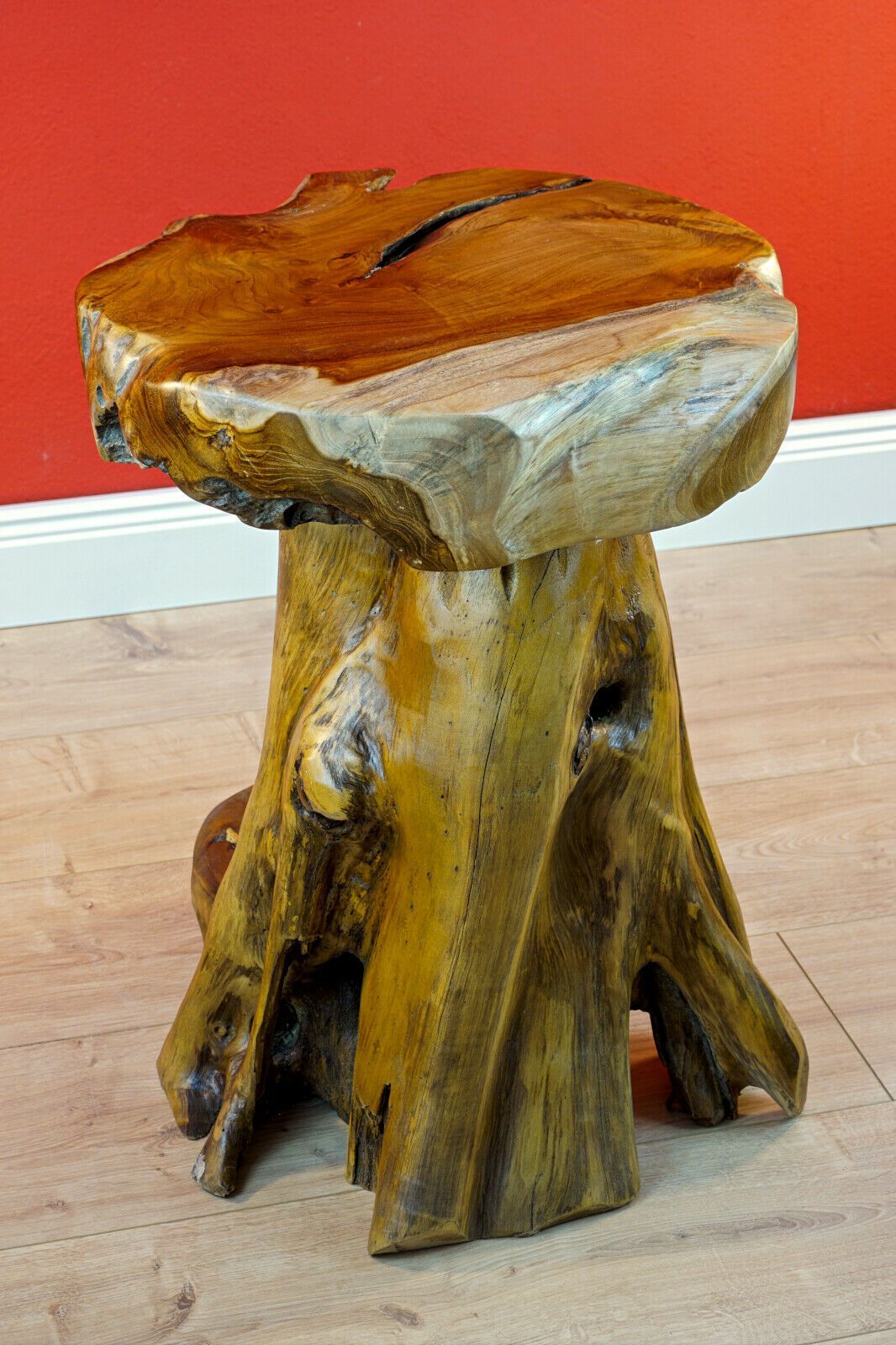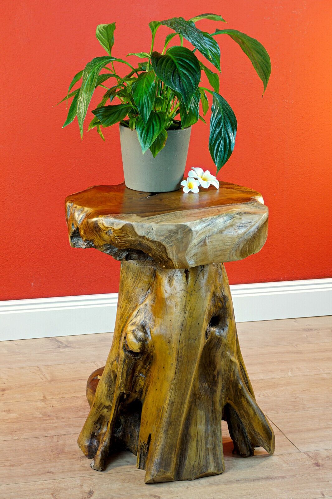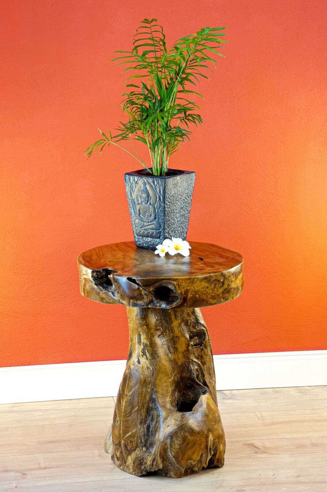 Beistelltisch JOMTIEN III Wurzelholz Beistelltisch JOMTIEN III Der Beistelltisch JOMTIEN III besticht durch seine natürliche Beschaffenheit und setzt als Blumenständer , oder aber auch als kleiner Beistelltisch oder Hocker auch in Ihrem Zuhause tropische Akzente. Dieses urige Stück Stamm eines Teakb