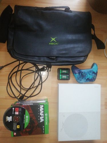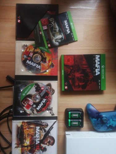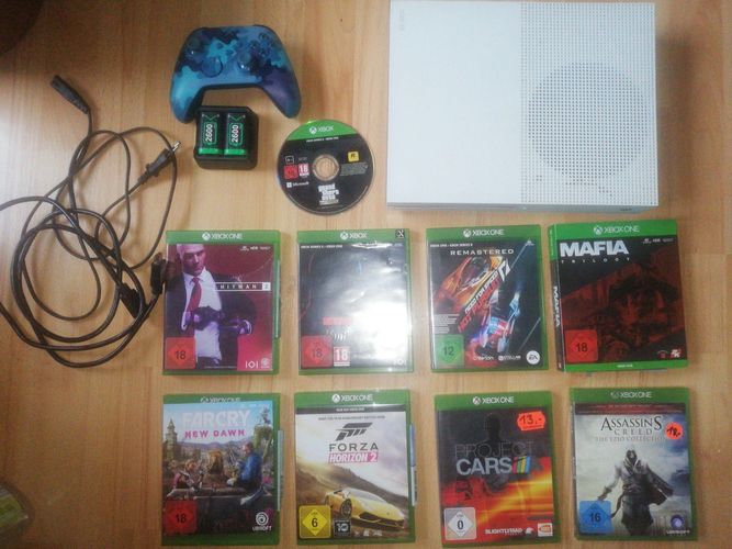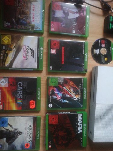 Xbox one S Konsole weiss+ 9 Games+Joypad mit Ersatzakku + Ledertasche für Transport. Alle Kabel dabei und alles funktioniert! )Bei den Spiel Mafia Trilogy fehlt eine CD das Spiel ist aber spielbar, das Spiel hat bei Amazon 50€ gekostet !) 4k Grafik guter Zustand Versand mit deutschen Post und K