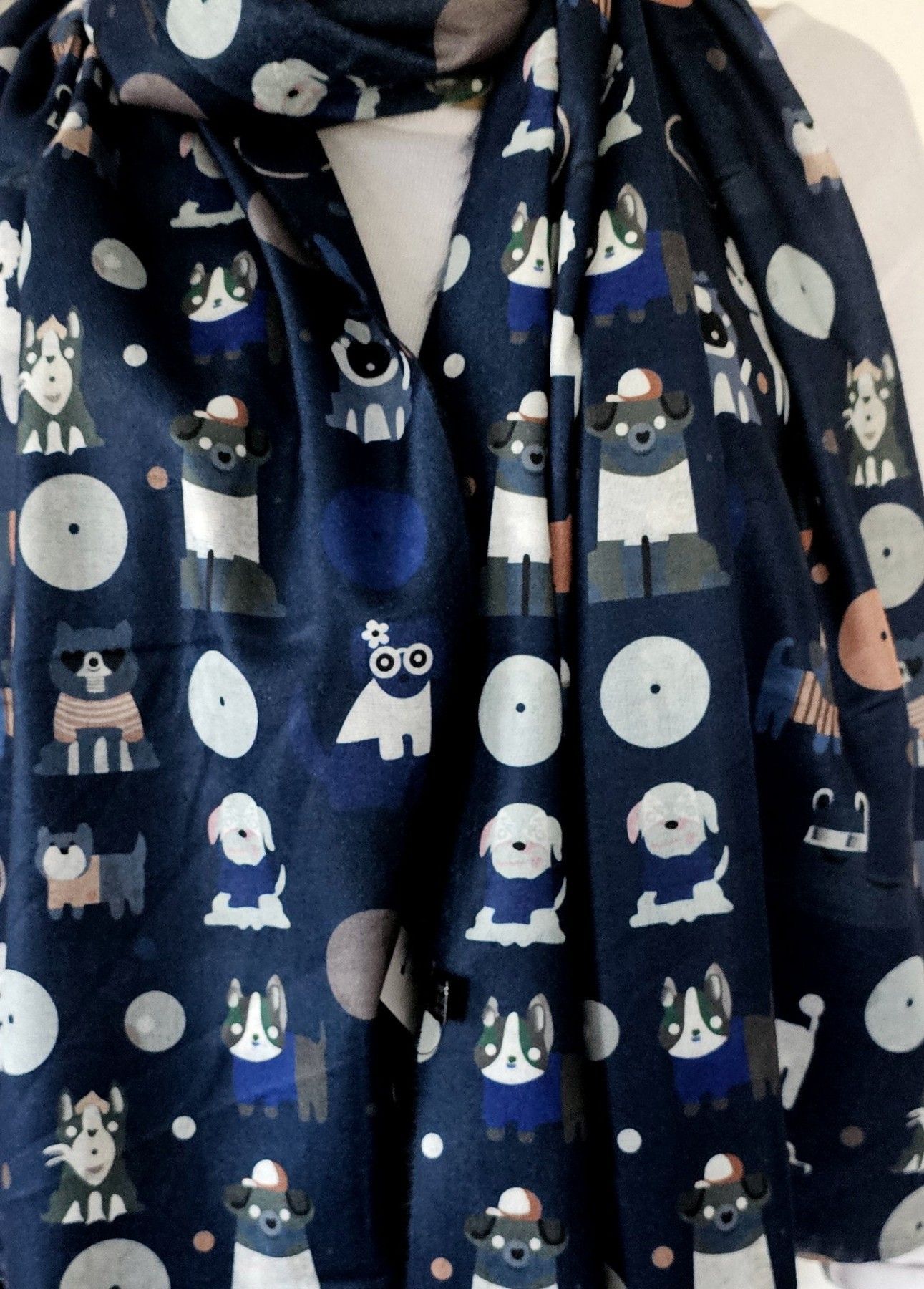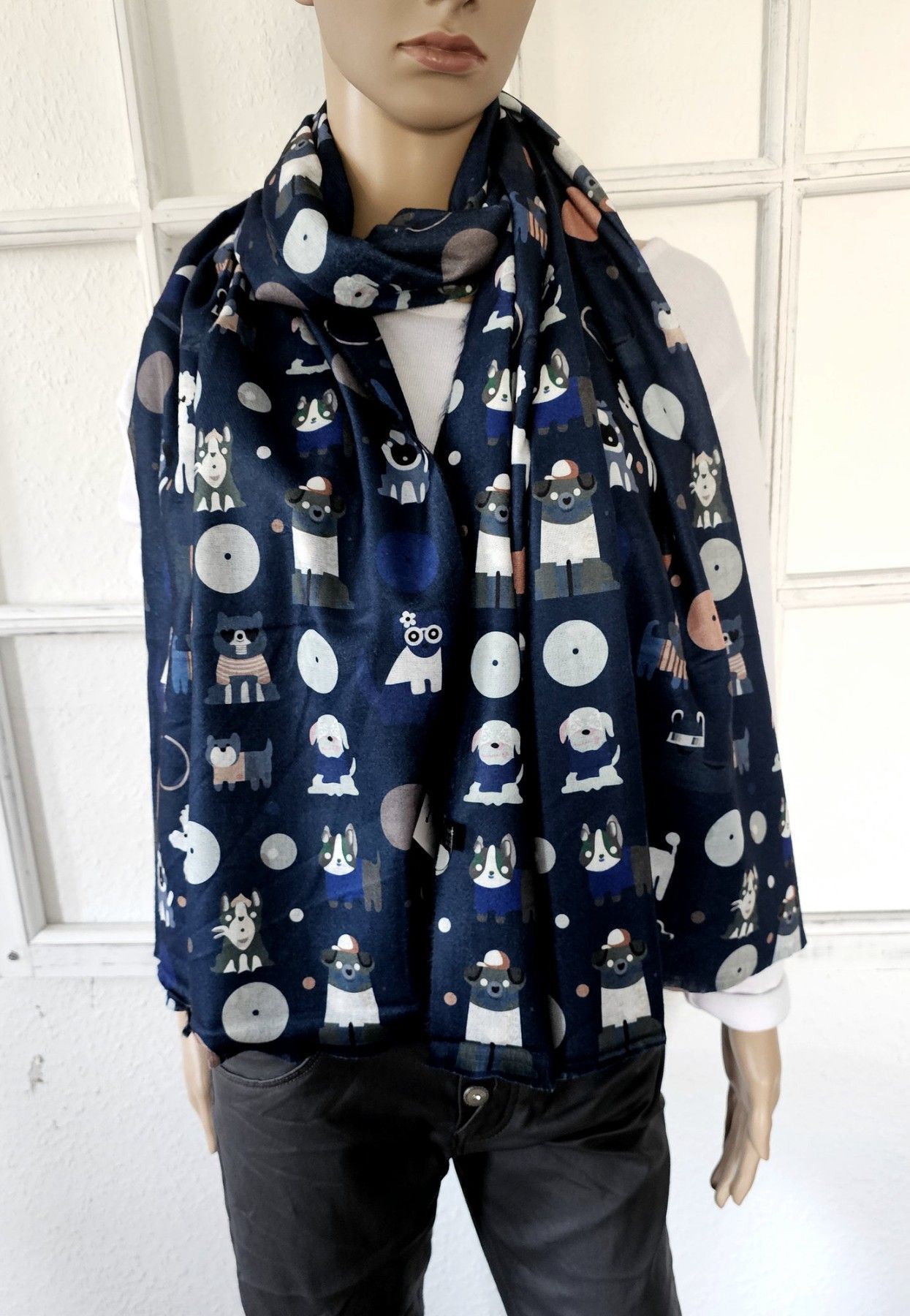 XL Winterschal Schal Tuch Halstuch weiche Viskose Hunderassen Dunkelblau/Bunt